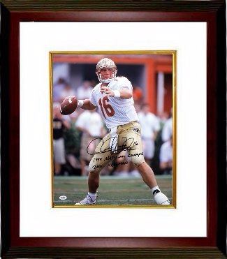 In 1998, Chris Weinke led the Florida State Seminoles to a 9–1 record and #2 national ranking before a season-ending neck injury forced him to the sidelines. During his junior season in 1999, he led the #1 ranked Seminoles to the school's second national championship, defeating Michael Vick and the Virginia Tech Hokies 46-29 in the Sugar Bowl. As a senior in 2000, Weinke led the nation in passing with 4,167 yards and won the Heisman Trophy, awarded to college football's best player, as well as the Davey O'Brien Award and the Johnny Unitas Award. He also led the Seminoles to the Orange Bowl for their third national championship game in as many years. Chris Weinke has hand autographed this Florida State Seminoles 16x20 Photo with 1999 National Champs & 2000 Heisman inscription. PSA Hologram and Certificate of Authenticity. Custom White Mat and Premium Mahogany Frame as shown