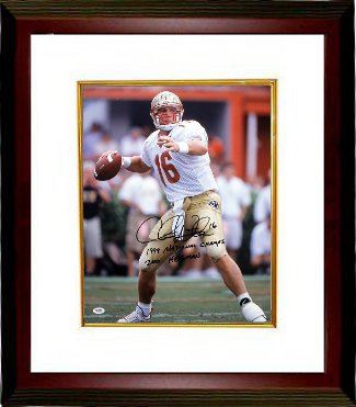 In 1998, Chris Weinke led the Florida State Seminoles to a 9–1 record and #2 national ranking before a season-ending neck injury forced him to the sidelines. During his junior season in 1999, he led the #1 ranked Seminoles to the school's second national championship, defeating Michael Vick and the Virginia Tech Hokies 46-29 in the Sugar Bowl. As a senior in 2000, Weinke led the nation in passing with 4,167 yards and won the Heisman Trophy, awarded to college football's best player, as well as the Davey O'Brien Award and the Johnny Unitas Award. He also led the Seminoles to the Orange Bowl for their third national championship game in as many years. Chris Weinke has hand autographed this Florida State Seminoles 16x20 Photo with 1999 National Champs & 2000 Heisman inscription. PSA Hologram and Certificate of Authenticity. Custom White Mat and Premium Mahogany Frame as shown
