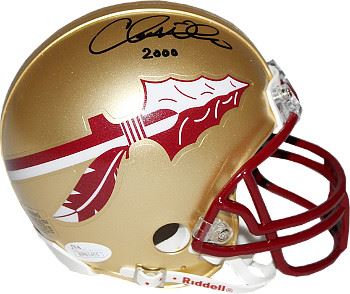 In 1998, Chris Weinke led the Florida State Seminoles to a 9–1 record and #2 national ranking before a season-ending neck injury forced him to the sidelines. During his junior season in 1999, he led the #1 ranked Seminoles to the school's second national championship, defeating Michael Vick and the Virginia Tech Hokies 46-29 in the Sugar Bowl. As a senior in 2000, Weinke led the nation in passing with 4,167 yards and won the Heisman Trophy, awarded to college football's best player, as well as the Davey O'Brien Award and the Johnny Unitas Award. He also led the Seminoles to the Orange Bowl for their third national championship game in as many years. Chris Weinke has hand autographed this Florida State Seminoles TB Riddell Mini Helmet with 2000 inscription. JSA Hologram and Certificate of Authenticity.