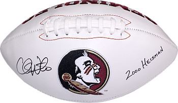 In 1998, Chris Weinke led the Florida State Seminoles to a 9–1 record and #2 national ranking before a season-ending neck injury forced him to the sidelines. During his junior season in 1999, he led the #1 ranked Seminoles to the school's second national championship, defeating Michael Vick and the Virginia Tech Hokies 46-29 in the Sugar Bowl. As a senior in 2000, Weinke led the nation in passing with 4,167 yards and won the Heisman Trophy, awarded to college football's best player, as well as the Davey O'Brien Award and the Johnny Unitas Award. He also led the Seminoles to the Orange Bowl for their third national championship game in as many years. Chris Weinke has hand autographed this Florida State Seminoles White Logo Football with 2000 Heisman inscription. JSA Hologram and Certificate of Authenticity..