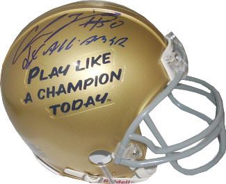 Chris Zorich received a scholarship to play college football at the University of Notre Dame in 1987 and began as a linebacker but was moved to nose tackle early in the season. Zorich then earned All-American honors the following season. In his first game, he had one and a half sacks and ten tackles against the University of Michigan and finished the year third on the team in tackles as Notre Dame went undefeated and won the national championship. During his junior year, he followed his initial season with a consensus All-America year in 1989 and was also one of four finalists for the Lombardi Award. Also in 1989 he was voted the UPI Lineman of the Year award as the top lineman in college football. As a senior, Zorich won the Lombardi Award and was recognized as a unanimous All-America. In the final game of his college career he was the Defensive Most Valuable player of the 1991 Orange Bowl. Chris Zorich has hand signed this Notre Dame Fighting Irish Play Like A Champion Logo Mini Helmet with 2X All American inscription. MAB Hologram and Certificate of Authenticity from Athlon Sports.