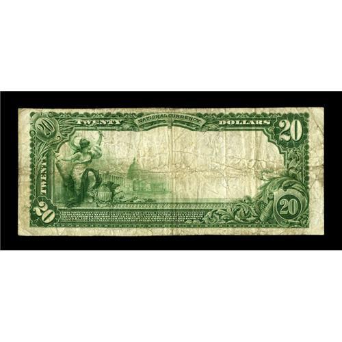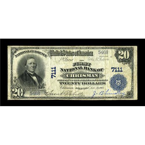 <B>Chrisman, IL</B></I> - $20 1902 Plain Back Fr. 650 <B>The First NB</B></I> Ch. # 7111<BR>Only three large size notes are known from this scarce one bank location. It last appeared in a September 2000 CAA sale. Pleasing <B>Fine-Very Fine</B></I> with interesting dual color signatures.<BR><BR><b>Shipping:</b> Coins & Currency (<a target="_blank" href="http://www.heritageauctions.com/common/shipping.php">view shipping information</a>)