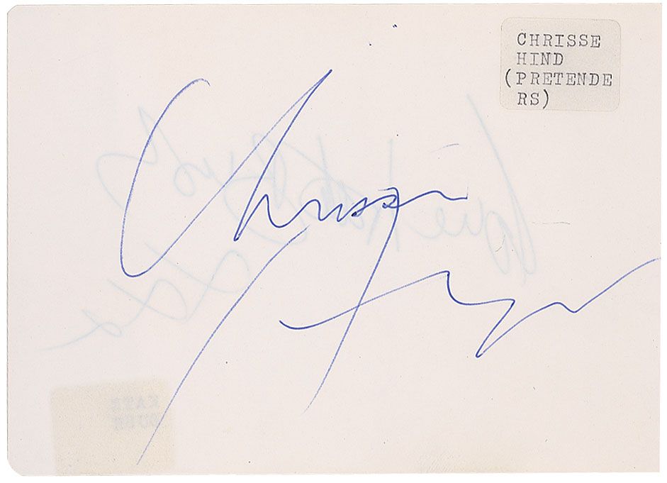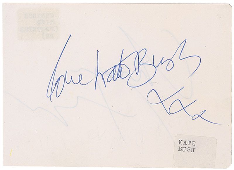 Ballpoint signatures, “Chrissie Hynde” and “Love, Kate Bush, xxx,” on opposite sides of a single off-white 5.5 x 4 album page. In fine condition. Accompanied by a certificate of authenticity from Tracks.