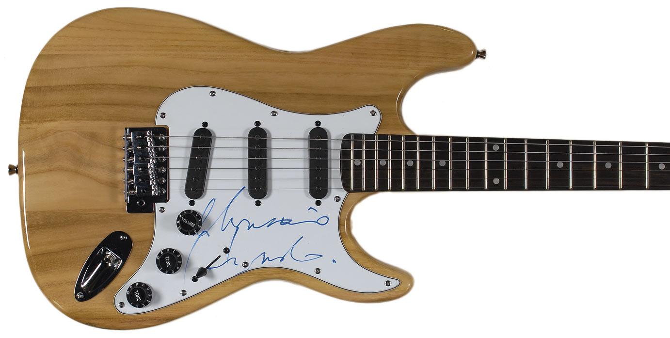Natural wood-finish Stedman Pro ‘stratocaster-style’ electric guitar, signed on the white pickguard in blue felt tip. In fine condition. Accompanied by a photo taken at time of signing. Oversized. Pre-certified PSA/DNA and RRAuction COA.
