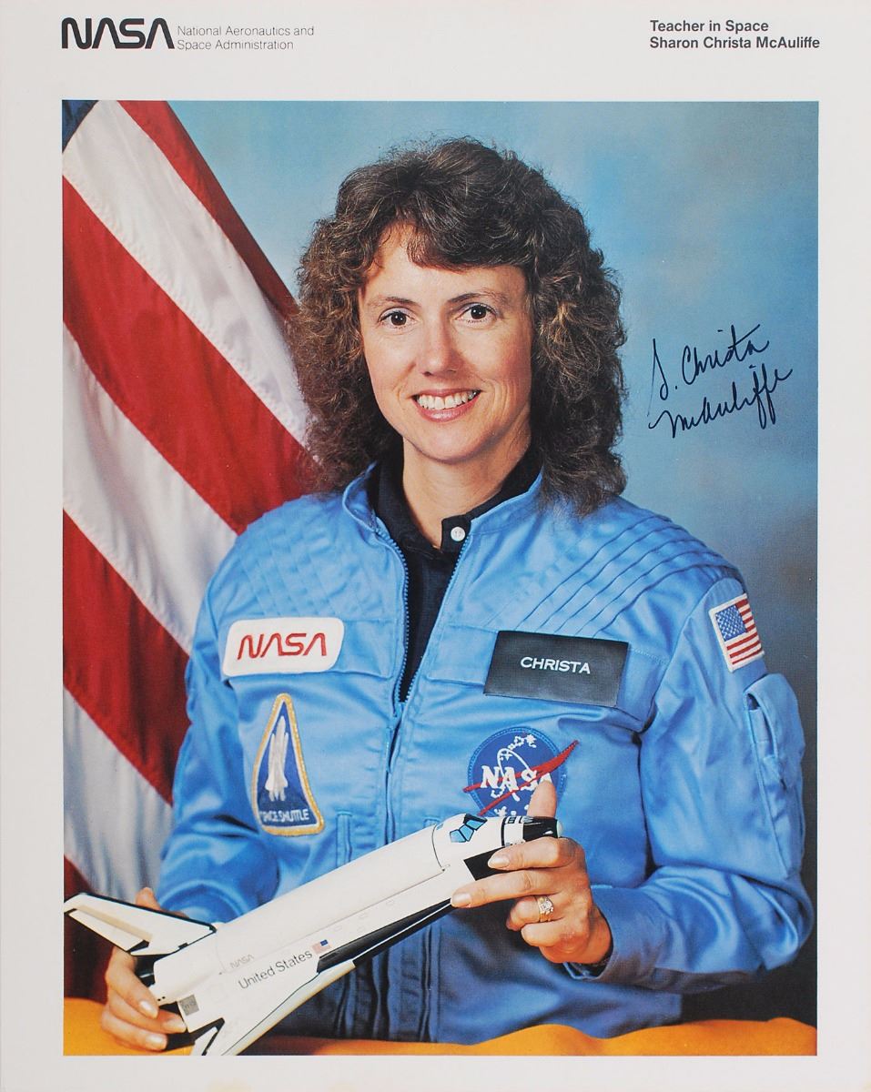 Official color 8 x 10 NASA lithograph of McAuliffe in her blue flight suit holding a Space Shuttle model, beautifully signed in black felt tip, “S. Christa McAuliffe.”
