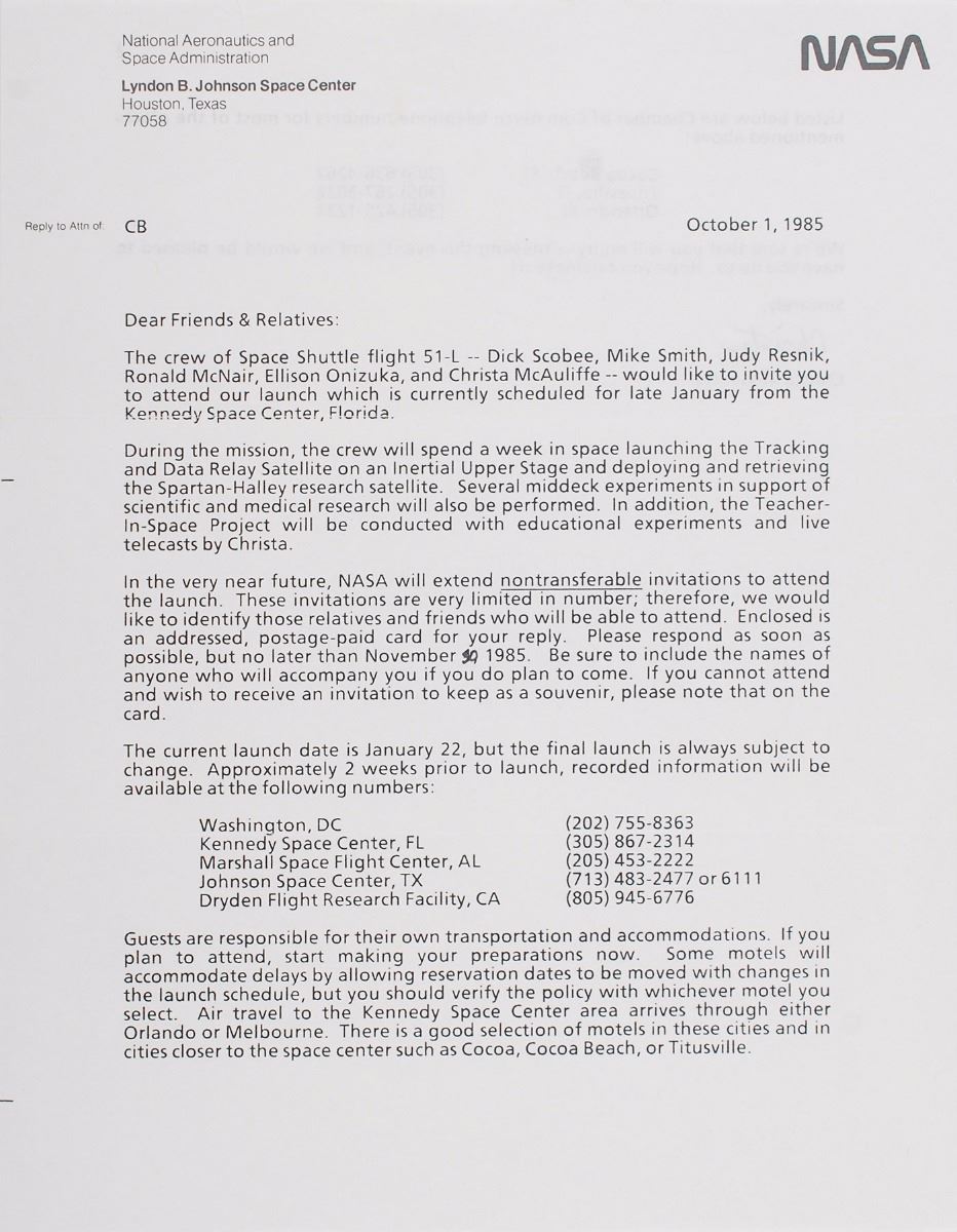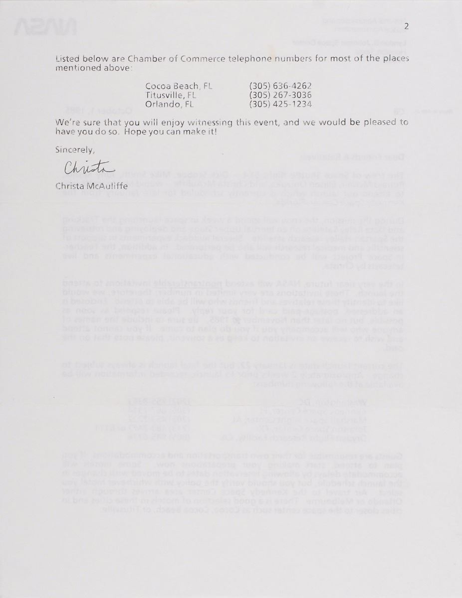 Typed form letter signed “Christa,” one page both sides, 8.5 x 11, NASA letterhead, October 1, 1985, in part: “In the very near future, NASA will extend nontransferable invitations to attend the launch. These invitations are very limited in number…We’re sure that you will enjoy witnessing this event, and we would be pleased to have you do so. Hope you can make it!” Accompanied by the original mailing envelope.
