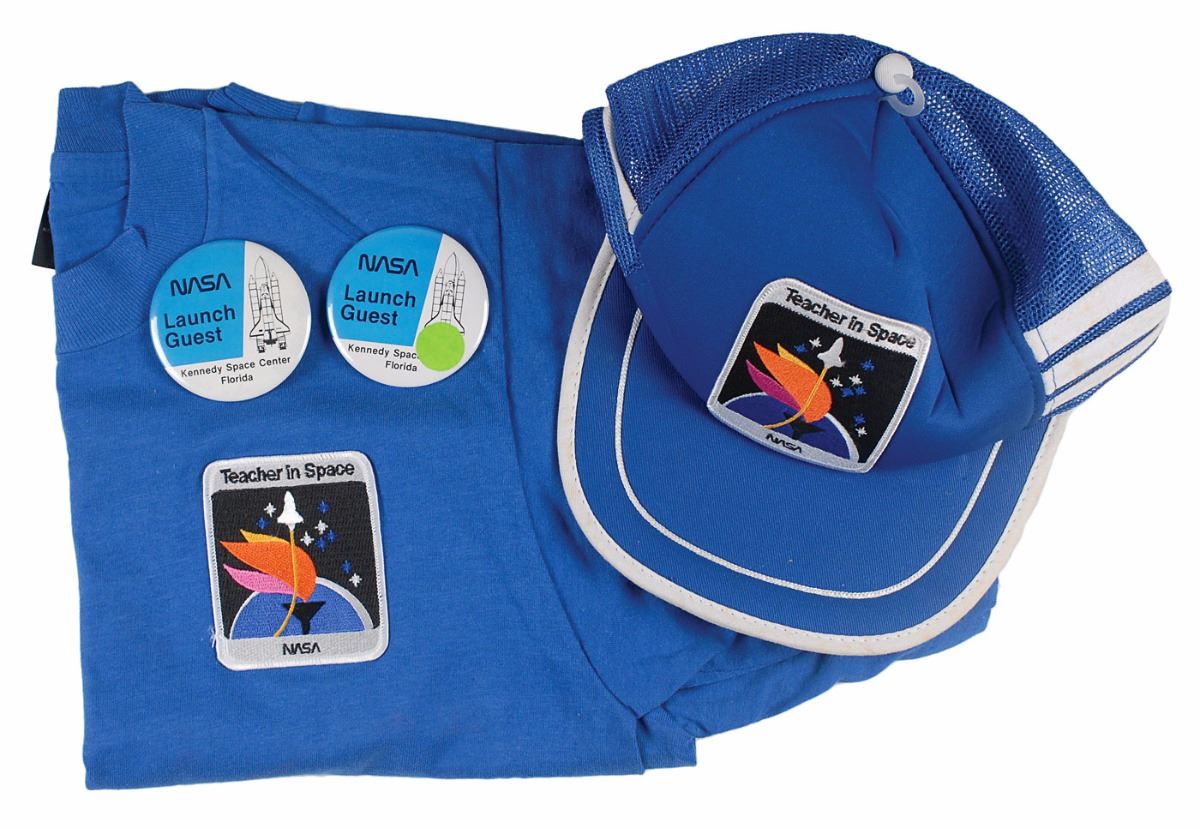 Included as well are two launch guest badges, unworn baseball cap and t-shirt featuring the Teacher in Space logo, and other ephemera representing both the preflight activities and tragic aftermath, including: an STS 51-L crew memorial service program in Cape Canaveral; a program for a memorial mass held for McAuliffe in Massachusetts; an official invitation card for the launch; an official invitation to a pre-launch reception; a revised invitation for the reception due to rescheduling; two official “Astronaut Guest” bus boarding passes for the launch for Art and Nancy Marasco; a folded card with guest information and a map of the Kennedy Space Center; and a four-page newsletter from the Marascos’ hometown of Lenox, Massachusetts, providing information on a memorial fund established by the Marascos in honor of McAuliffe. Some additional memorial programs and news clippings are also present. In overall fine condition. The Marascos were friends of McAuliffe’s parents, Edward and Grace Corrigan, for over 35 years at the time of the disaster and soon after established a fund in her memory to support science education in their local school system. Most of the pieces in this collection are rare on their own, and this close personal association elevates the group even further.
