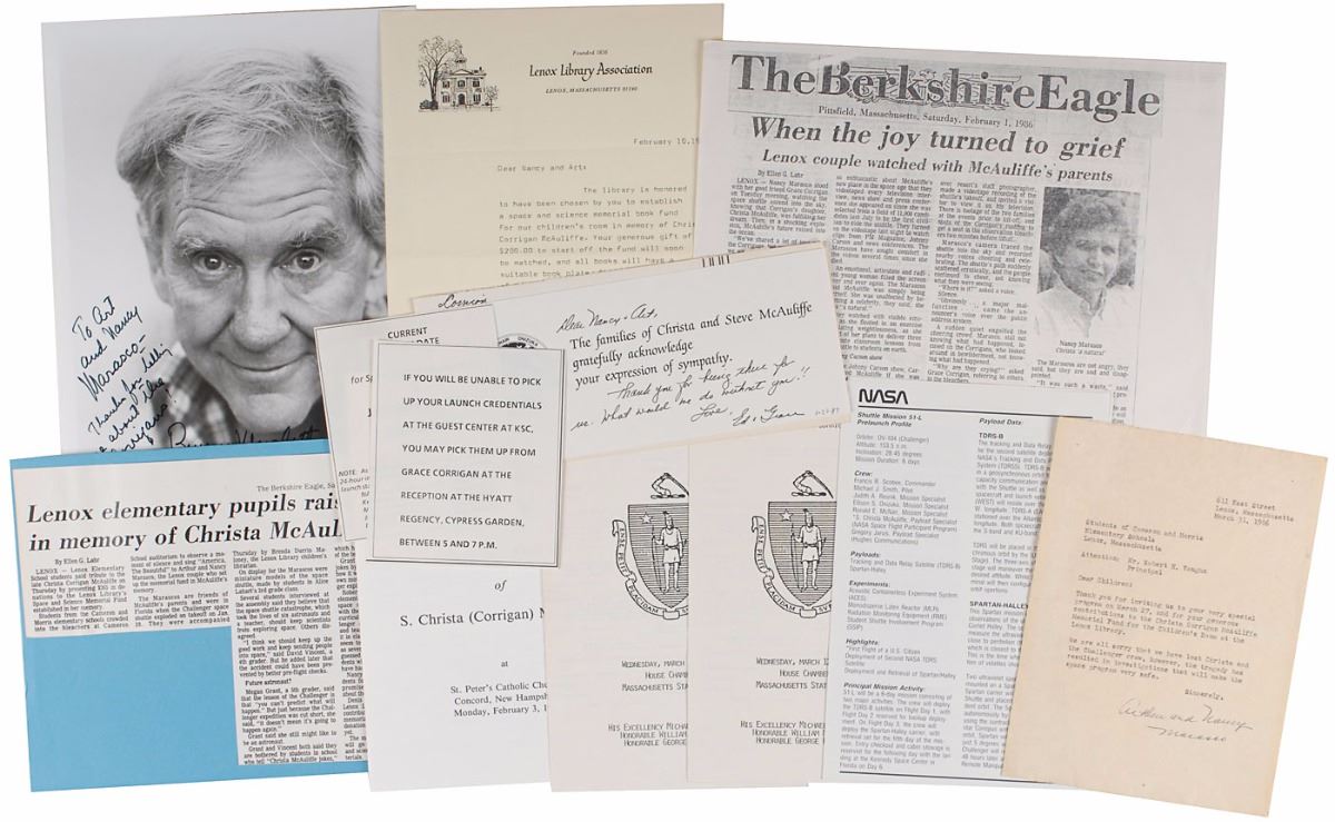 Historic group of material related to Christa McAuliffe and the NASA Teacher in Space Project from the collection of her close family friends Arthur and Nancy Marasco, who were present at the disastrous launch. Includes signed photos of McAuliffe and her backup teacher Barbara Morgan, an invitation letter to the launch signed by McAulliffe, and additional ephemera. The signed items include: