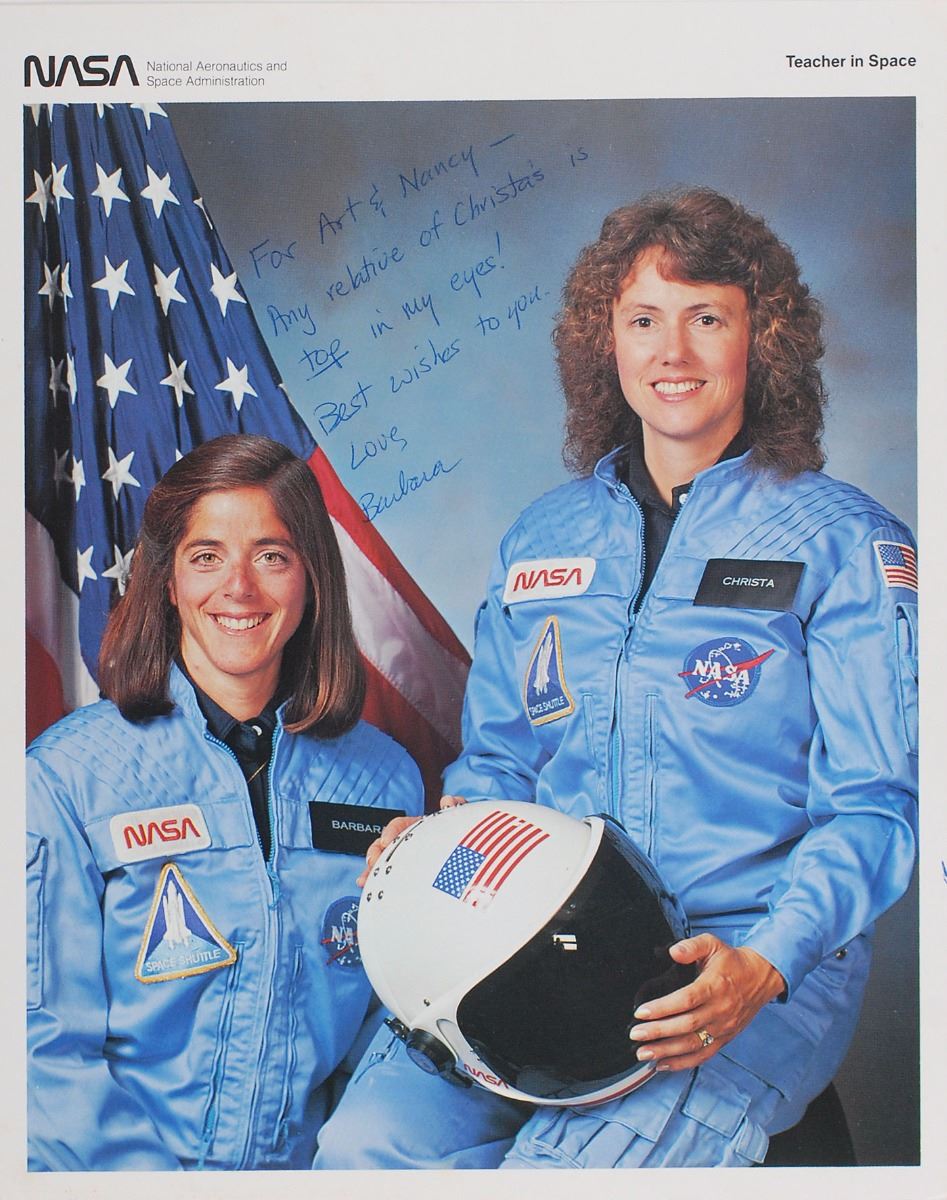 Official color 8 x 10 NASA lithograph showing both McAuliffe and Barbara Morgan, signed and inscribed in blue ballpoint by Morgan, “For Art & Nancy—Any relative of Christa’s is top in my eyes! Best wishes to you. Love, Barbara.”