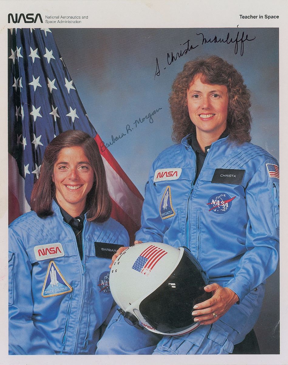 Official color 8 x 10 NASA lithograph of the pair selected for the Teacher in Space Project, signed in black felt tip, “S. Christa McAuliffe” and “Barbara R. Morgan.” A mild horizontal bend to the upper portion of the photo and a couple light creases to the right edge, otherwise fine condition.