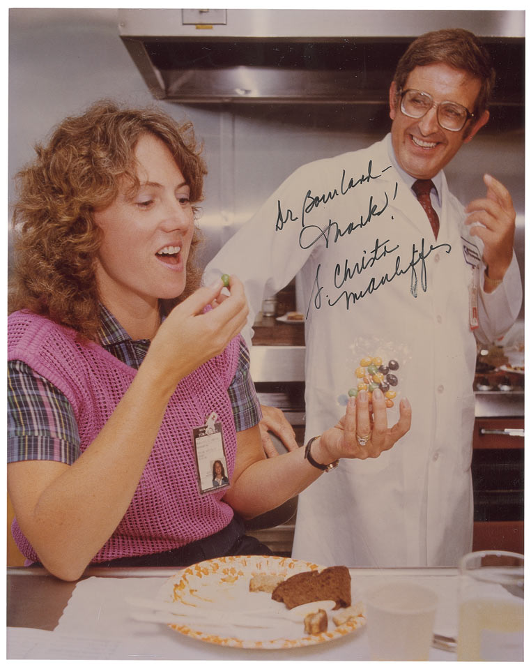 Color glossy 8 x 10 photo of Teacher in Space Participant Christa McAuliffe during a dietary orientation session with NASA food scientist Charles Bourland, signed and inscribed in black felt tip “Dr. Bourland—Thanks! S. Christa McAuliffe.” In fine condition, with brush to the first “f” in McAuliffe’s last name and a couple tiny creases. A one-of-a-kind pose that appeared on the front page of the September 11, 1985 issue of the Houston Post newspaper.