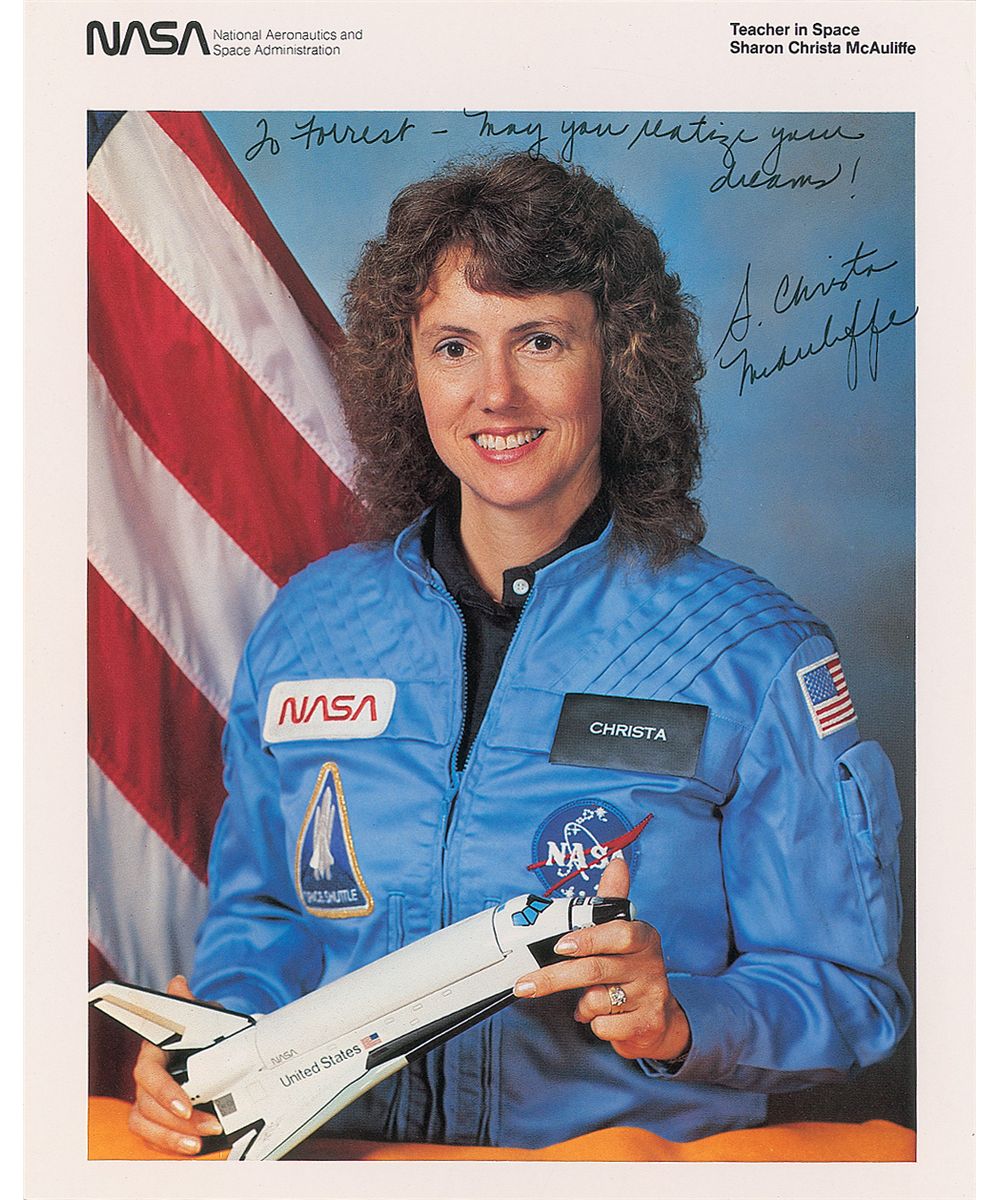 Color 8 x 10 NASA photo of McAuliffe holding a space shuttle model, signed and inscribed in black ink “To Forrest—May you realize your dreams! S. Christa McAuliffe.” In fine condition.