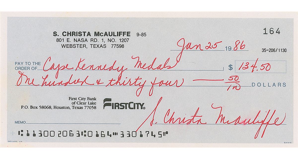 Uncanceled personal check, 6 x 2.75, filled out and signed by McAuliffe, “S. Christa McAuliffe,” payable to Cape Kennedy Medals for $134.50, January 25, 1986. In very fine condition. Cape Kennedy Medals was a Cocoa Beach, Florida, company that manufactured mission patches, medallions, pins, and other related souvenirs and memorabilia for shuttle crews. The Challenger crew ordered such mementos for their upcoming mission while in quarantine at crew quarters before their flight, with McAuliffe’s check dated just three days before the launch.