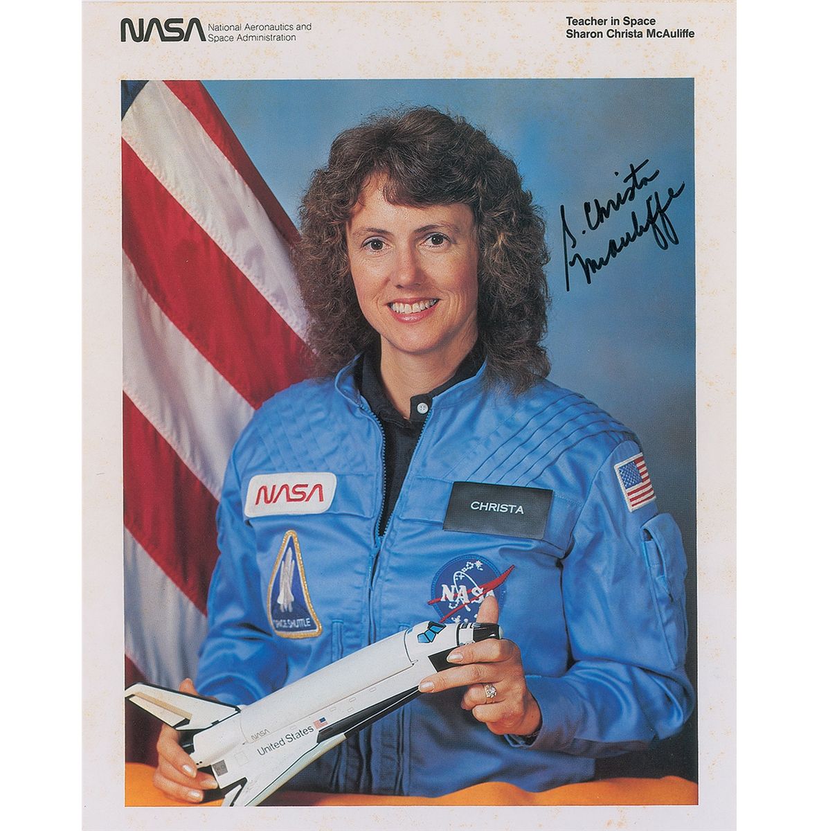 Official color 8 x 10 NASA lithograph of McAuliffe in her blue flight suit and holding a model of the space shuttle, signed in black felt tip, “S. Christa McAuliffe.” Scattered light foxing to borders, otherwise fine condition.