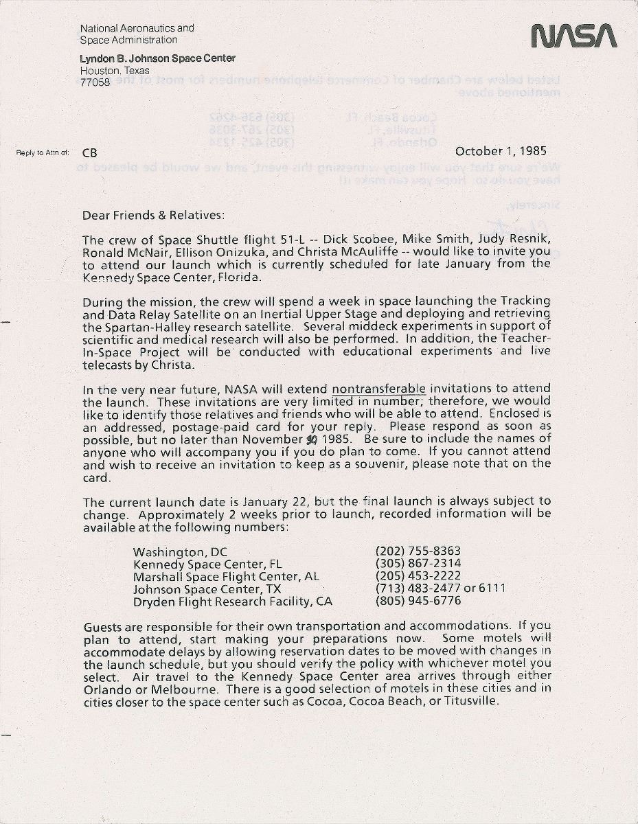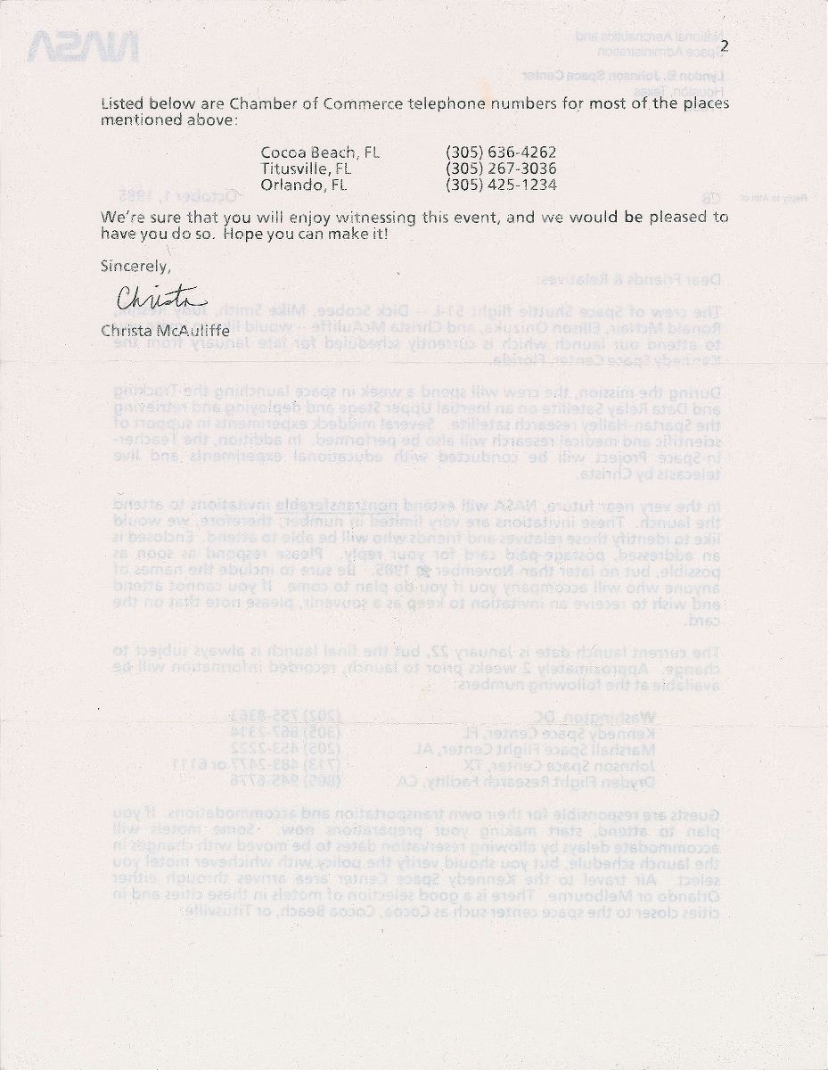 TLS signed “Christa,” one page both sides, 8.5 x 11, NASA letterhead, October 1, 1985. Invitation letter to addressed to Mr. and Mrs. Arthur Marasco, in part: “The crew of Space Shuttle flight 51–L—Dick Scobee, Mike Smith, Judy Resnik, Ronald McNair, Ellison Onizuka, and Christa McAuliffe—would like to invite you to attend our launch which is currently scheduled for late January from the Kennedy Space Center, Florida. During the mission, the crew will spend a week in space launching the Tracking and Data Relay Satellite on an Inertial Upper Stage and deploying and retrieving the Spartan–Halley research satellite. Several middeck experiments in support of scientific and medical research will also be performed. In addition, the Teacher-In-Space Project will be conducted with educational experiments and live telecasts by Christa.” In fine condition. Accompanied by the original mailing envelope.