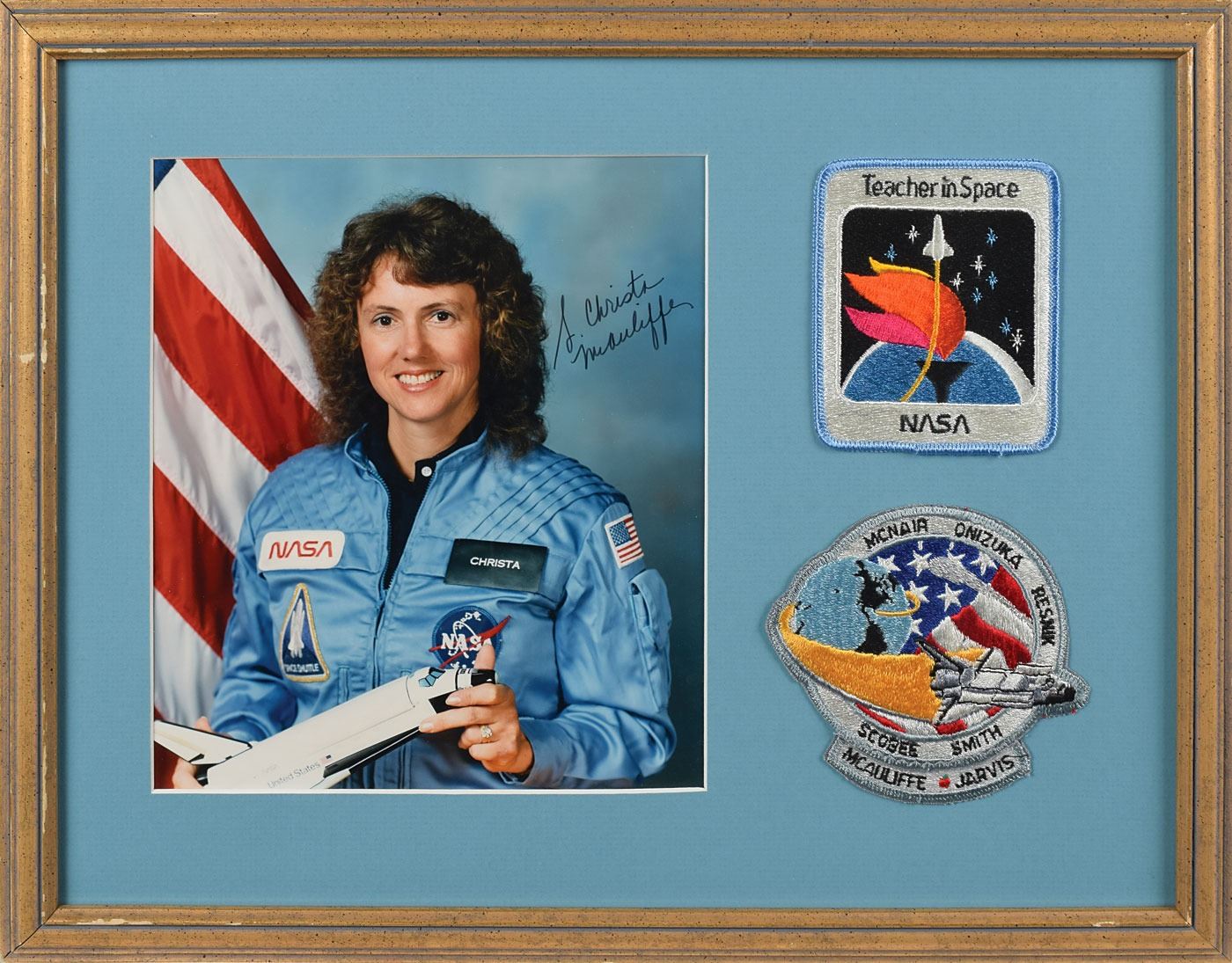 Color semi–glossy 7.5 x 8.75 photo of McAuliffe wearing her blue flight suit and holding a model of the Space Shuttle Orbiter, signed in black felt tip, "S. Christa McAuliffe." Matted and framed with embroidered patches for the Teacher in Space program and for the STS–51–L mission to an overall size of 16.75 x 13.25. In fine condition.