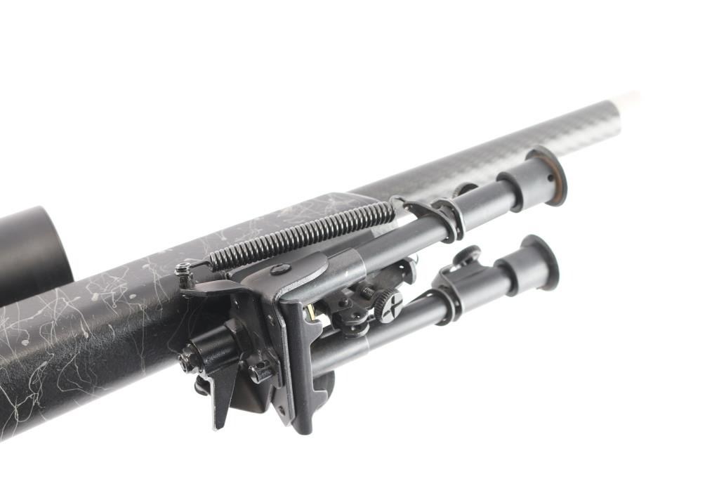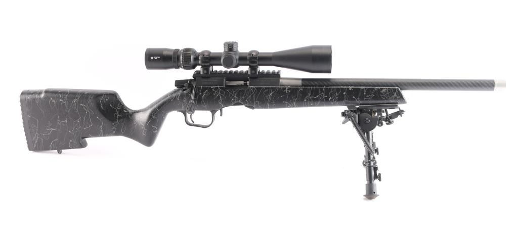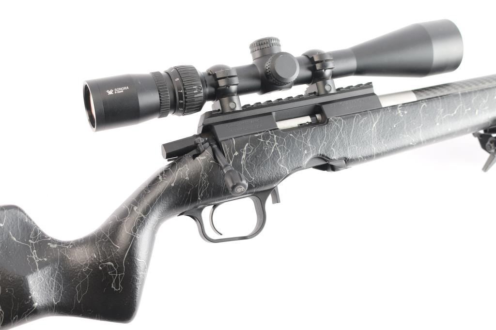 American made bolt-action rimfire rifle chambered in .17 HMR, and manufactured in Gunnison, UT. Rifle has a matte black anodized aluminum finish and a carbon fiber tension barrel. Rifle features a 18" hand-lapped threaded barrel with a 1:9 twist rate, smooth thread protector, no provisions for iron sights, detachable rotary box magazines, extended magazine release, serrated curved adjustable TriggerTech trigger, turned down bolt handle with fluted bolt knob, receiver mounted bolt release, serrated lever style receiver mounted safety, and integral picatinney rail on the top of the receiver. The black carbon fiber composite furniture consists of a smooth palm swelled pistol grip shoulder stock, sling studs on the forend and shoulder stock, integrated pillar bedding system, free-floated barrel, smooth forend, and serrated soft rubber recoil pad with black spacer. Receiver retains approximately 99% of its original anodized finish with light blemishes on the receiver's scope rail. The carbon fiber condition is also excellent. Metal displays no rust, or deformation. The action is smooth and crisp, and the bore is bright with strong rifling. The composite furniture is in excellent condition with nothing remarkable. Rifle includes one rotary magazine, and a mounted bipod. Rifle is mounted with a Vortex Sonora 4-12x44mm scope with windage and BDC markings, and the sight picture is bright and clear.