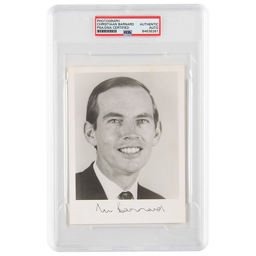 Matte-finish 4.75 x 6.5 head-and-shoulders photo of the pioneering cardiac surgeon, signed in the lower border in black felt tip, "Ch. Barnard." In fine condition, with light edge rippling. Encapsulated in a PSA/DNA authentication holder.