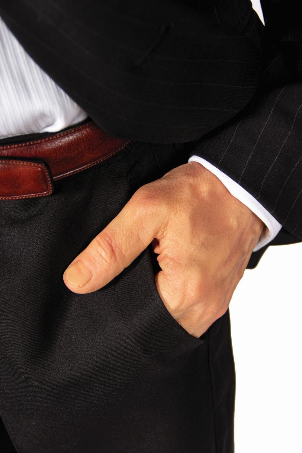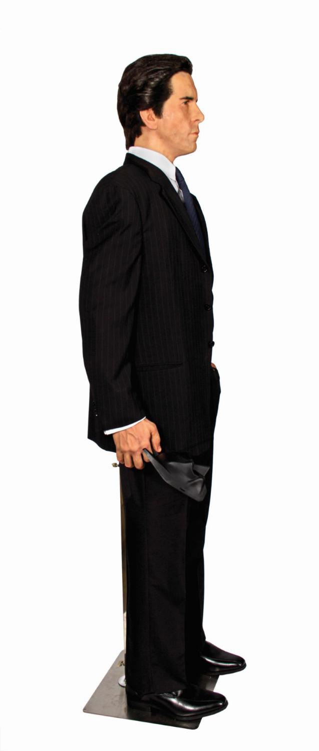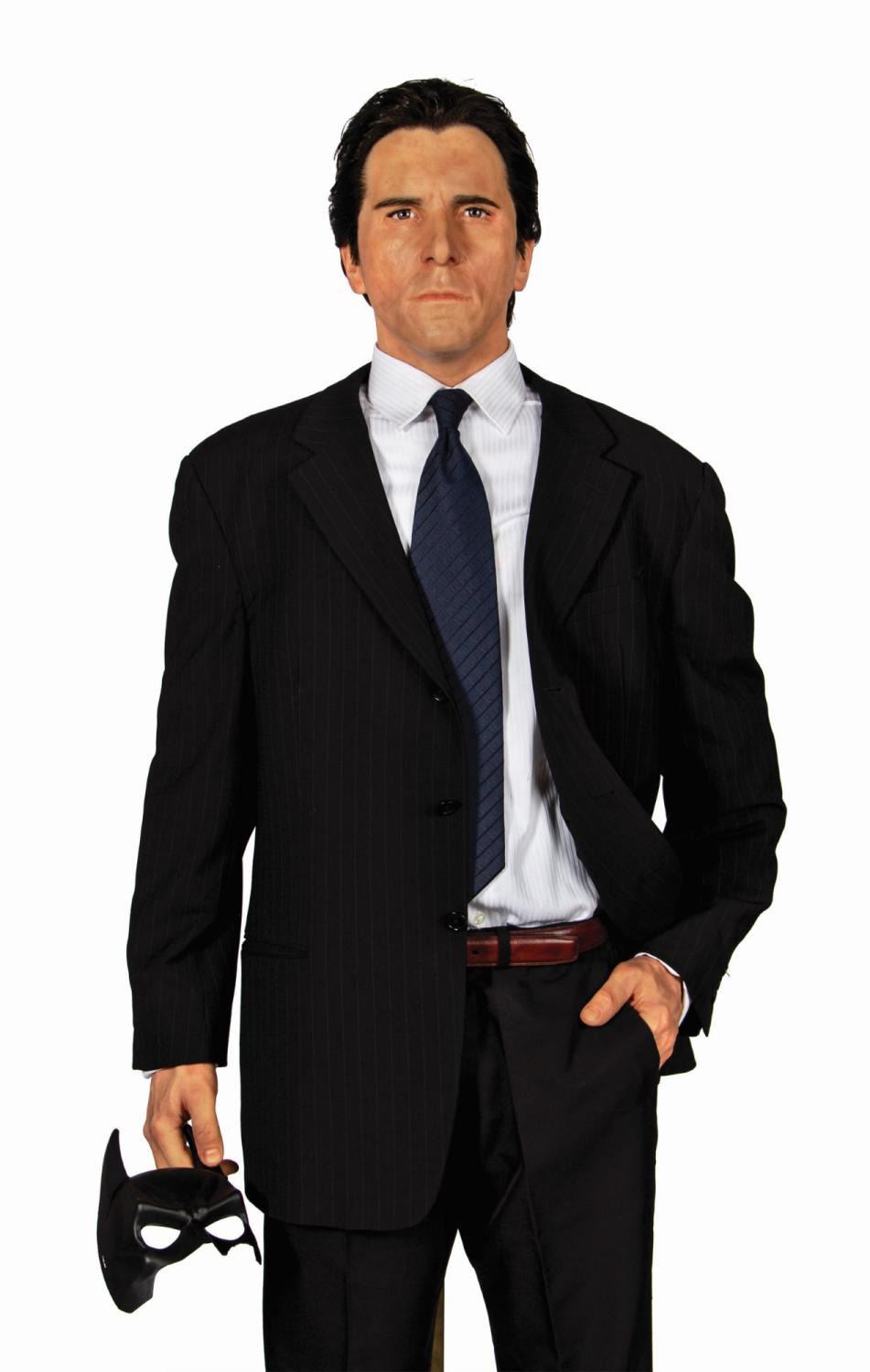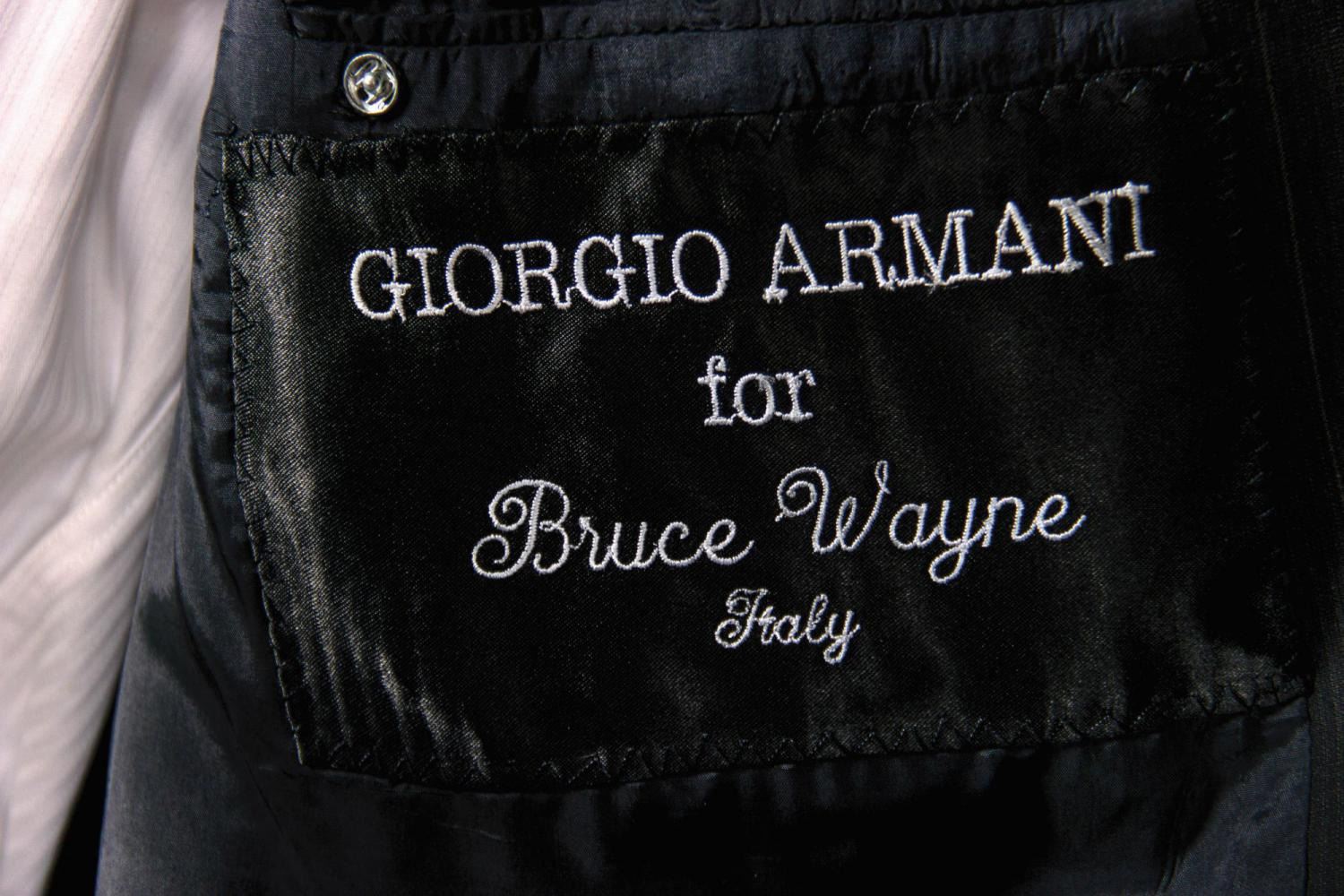 (Warner Bros., 2005) An original bespoke suit jacket created by Giorgio Armani for Christian Bale as “Bruce Wayne” in Batman Begins. Constructed of charcoal pinstriped wool, the suit jacket features notched lapels, a left breast broad welt pocket, hip welt pockets, three buttons at either sleeve cuff, and two button front closure. The internal black silk lining retains an Armani label above the interior right breast pocket, and the interior left breast pocket features a special embroidered label that reads, “Giorgio Armani for Bruce Wayne Italy.” The jacket is presented on a body form with hyper-realistic cast silicone head and hands, expertly studio painted and finished with hand punched hair and prosthetic grade glass eyes. Trousers, a button-down shirt, a belt, shoes, and a Batman mask have been added for display. Measuring approximately 72.5”x23” and 11.5” deep, the impressive, incredibly life-like custom display figure is in fine condition with only minor wear.