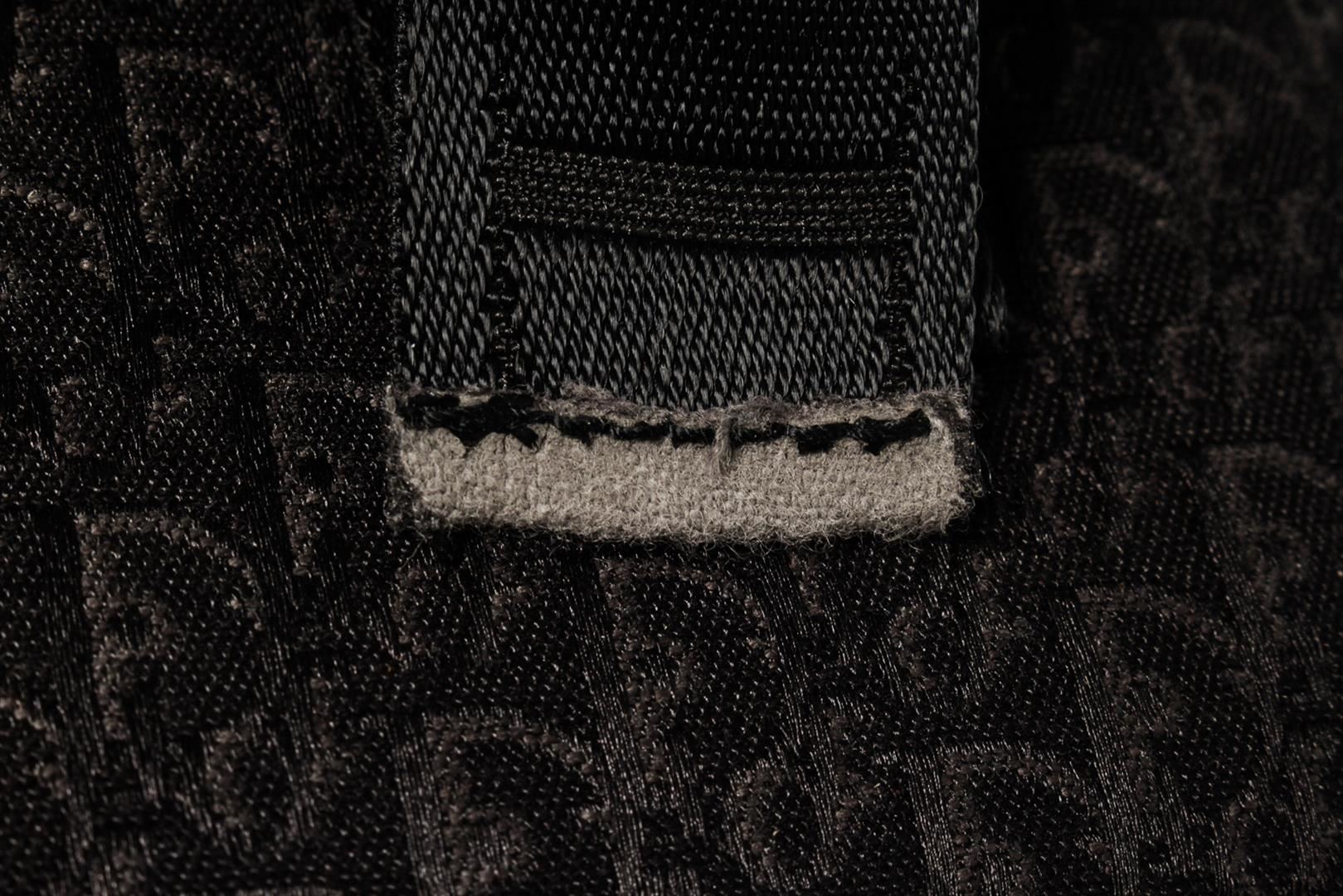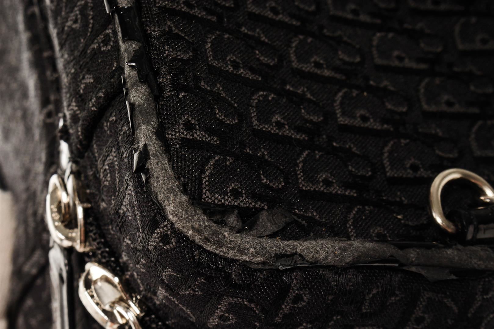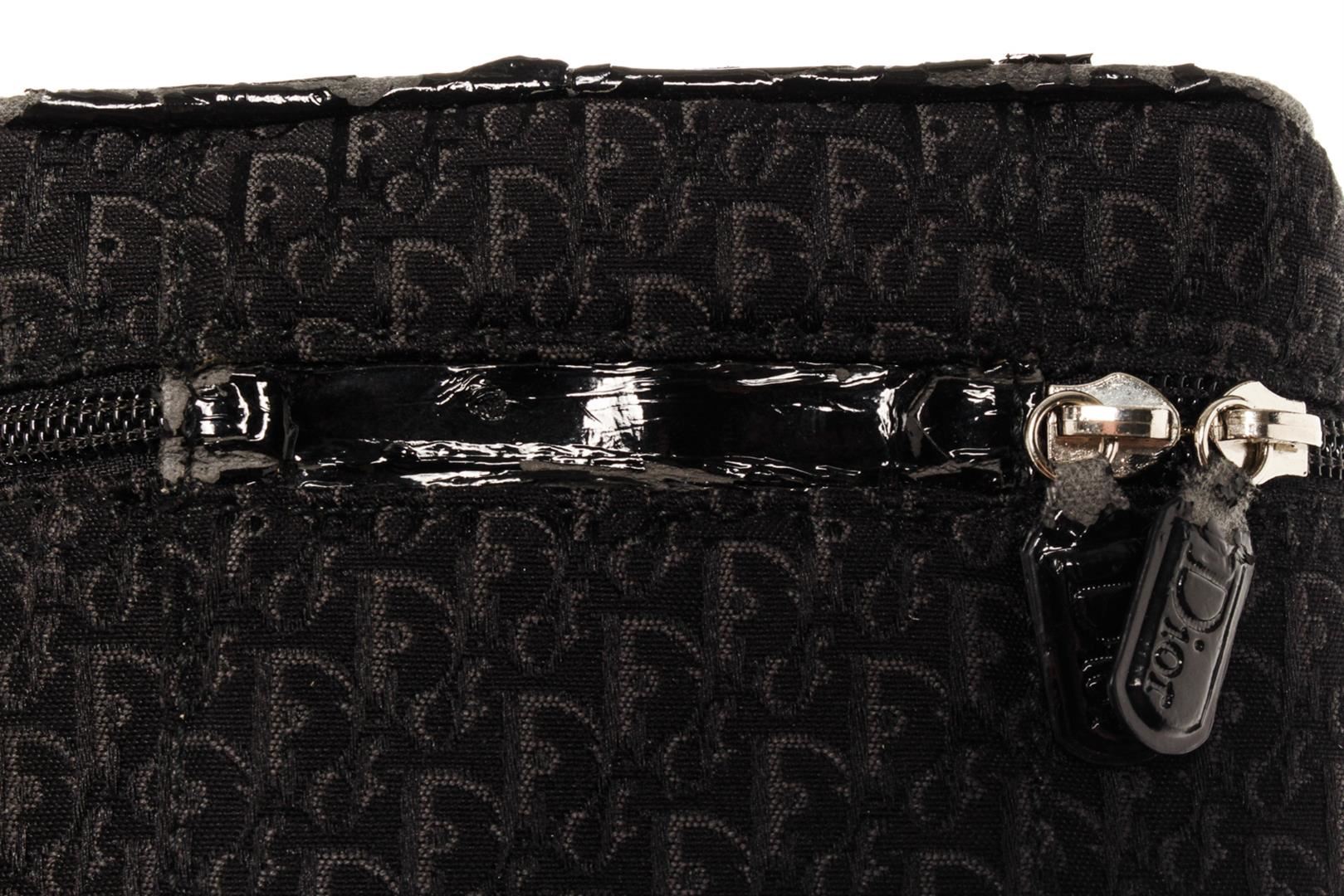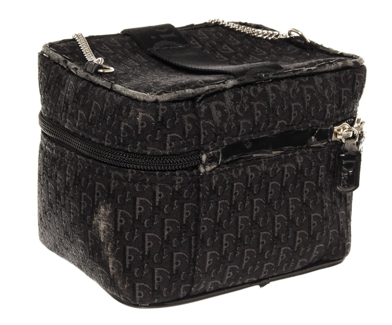 Black Trotter canvas Christian Dior Mini Chain vanity bag with silver-tone hardware, a chain-link handle with engraved Dior logo enamel at top, black canvas strap with buckle detail, zip-around closure and black canvas lining. W5.9 x H4.5 x D4.7" / Han