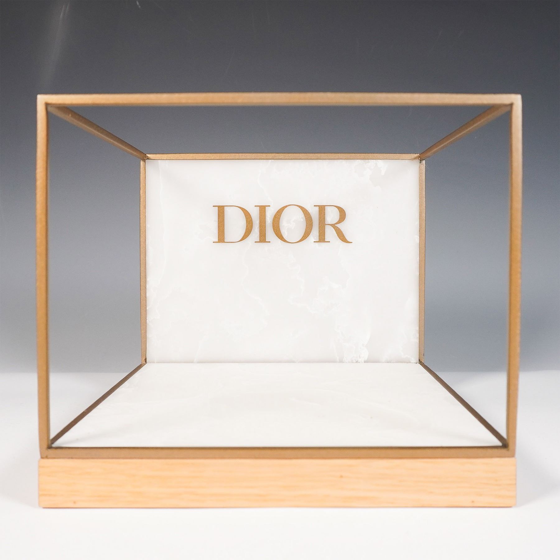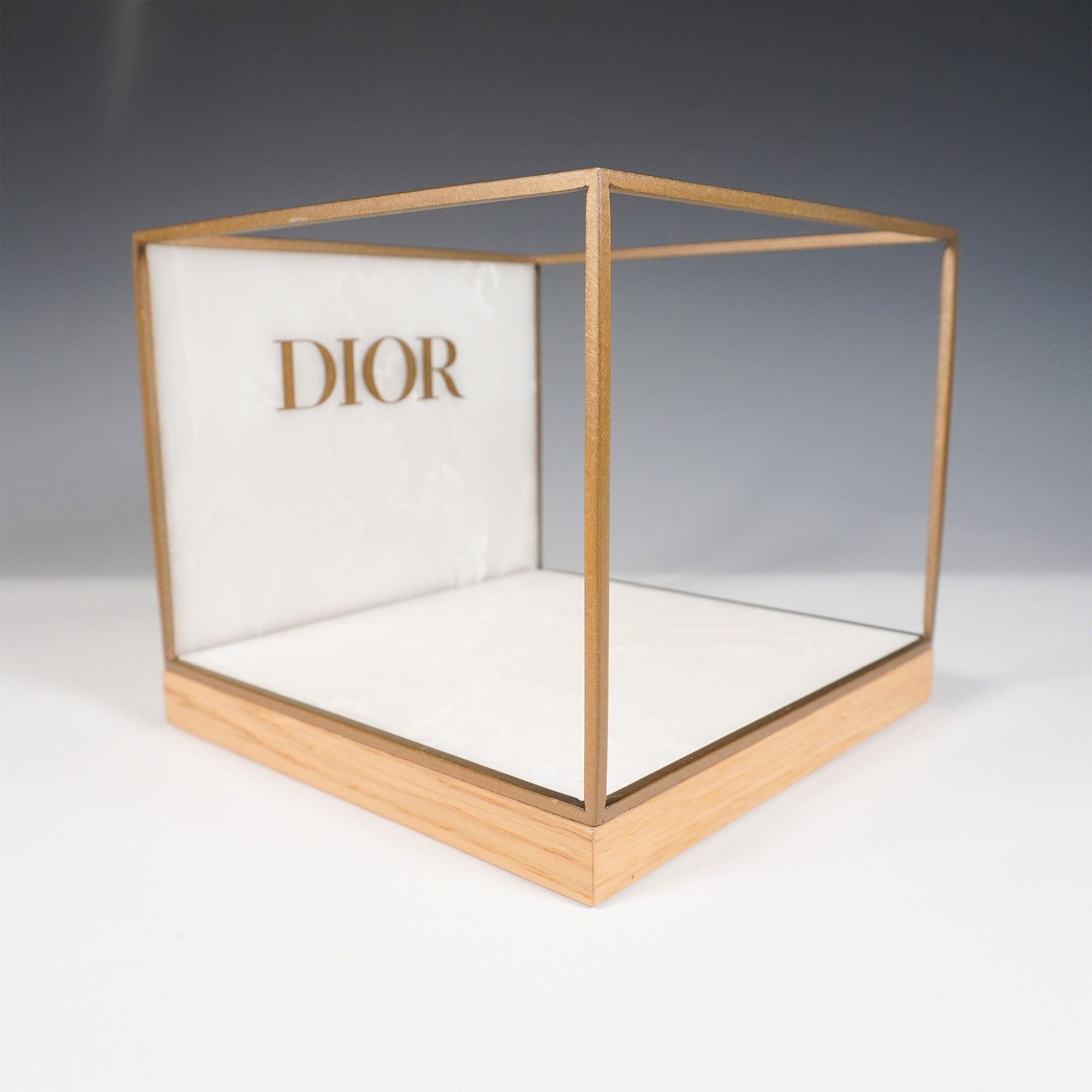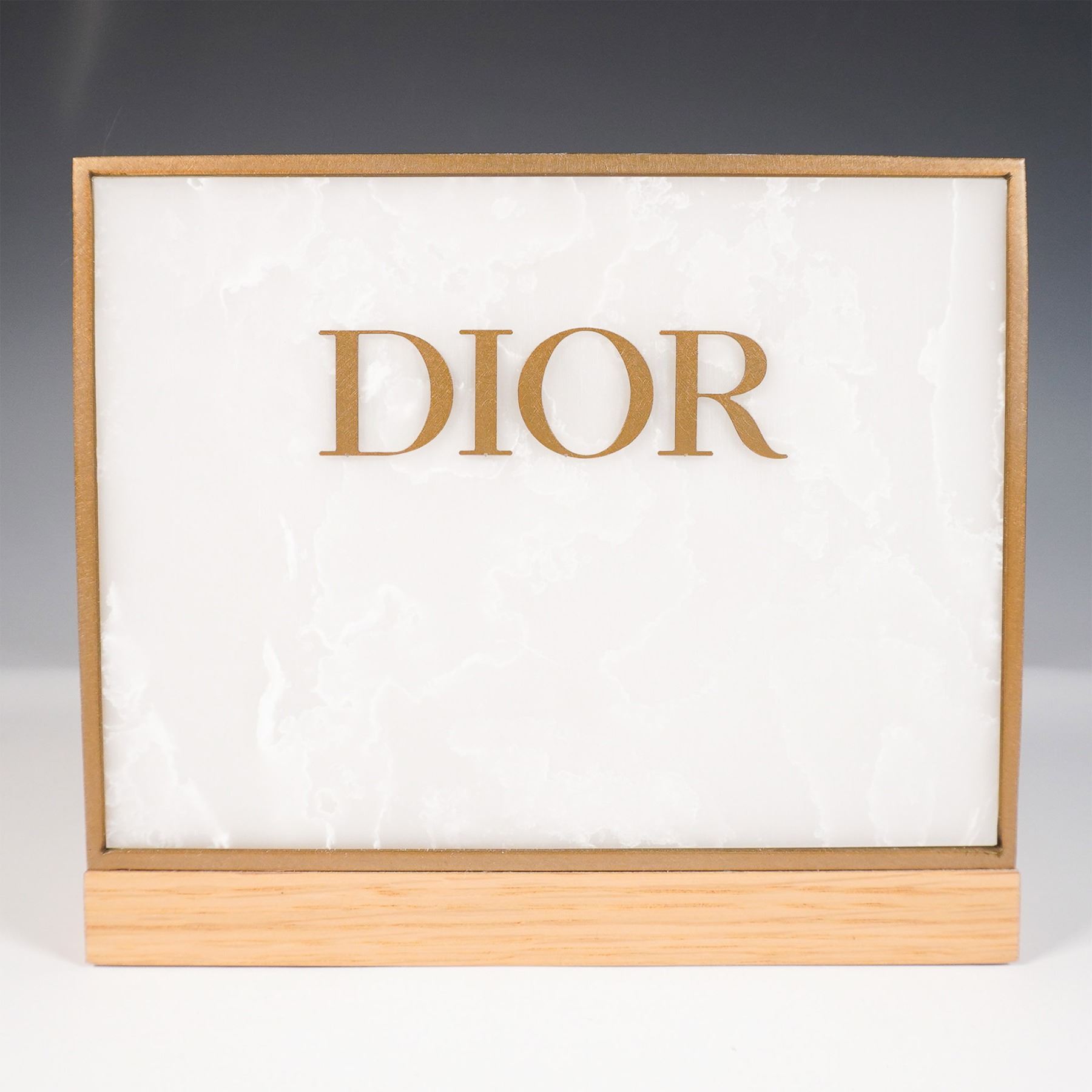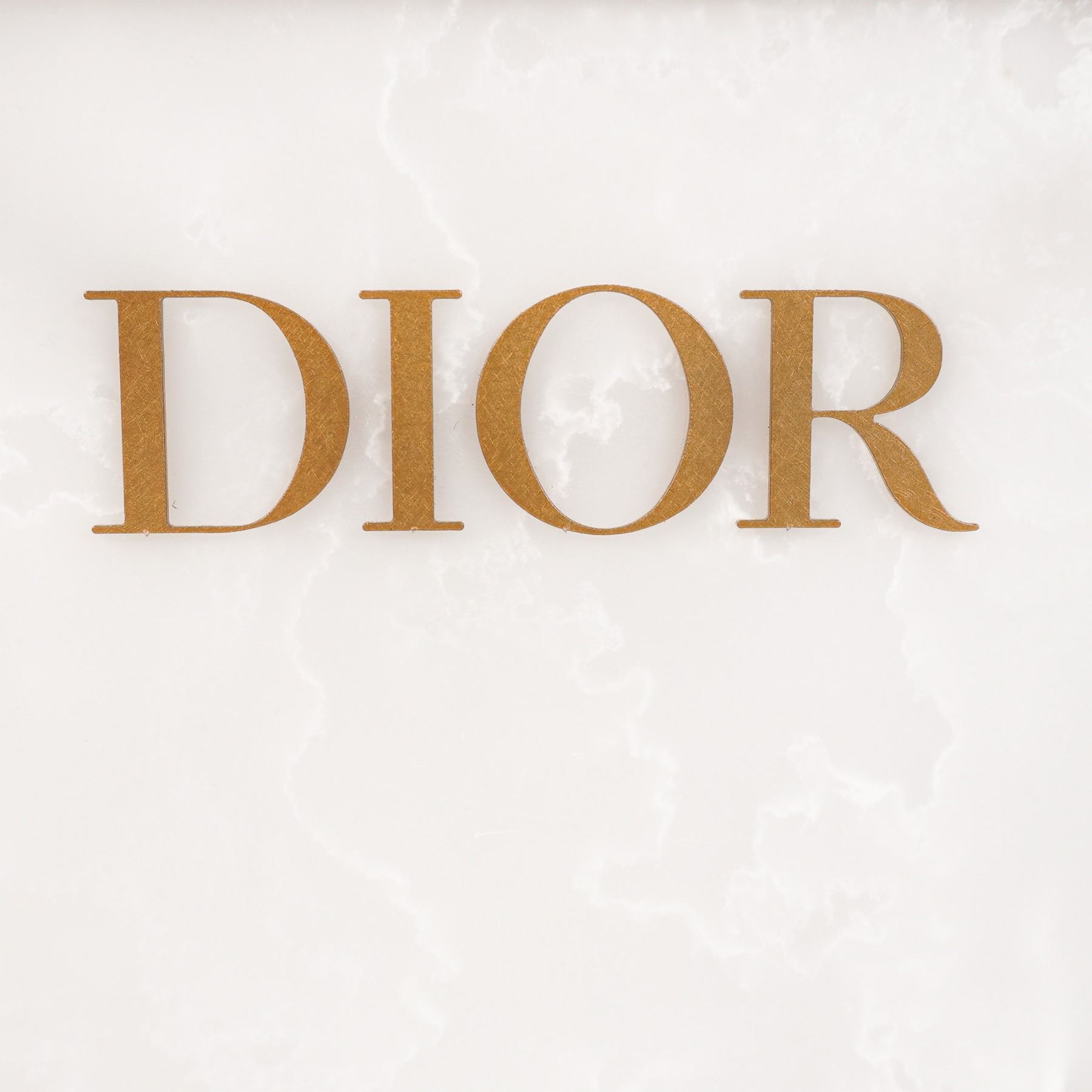 This sleek display stand elegantly showcases the Dior name set against a sophisticated white plexiglass background, framed in metal and mounted on a wooden base. The combination of materials adds a contemporary touch to the classic luxury associated with the Dior brand. A label on the back of the stand bears the reference number 6482, marking its specific production run, which could be of particular interest to collectors of high-end retail memorabilia or aficionados of branded displays. This item is an excellent representation of modern design and brand prestige, making it a valuable addition to any collection.