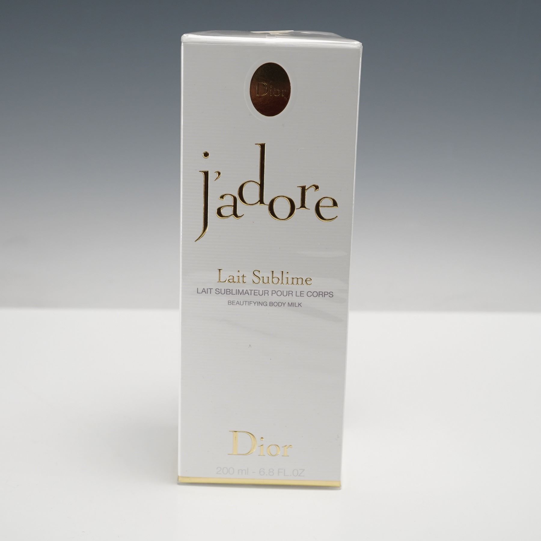 A sealed bottle of Dior J'adore Lait Sublime Beautifying Body Milk formulated to hydrate and illuminate the skin. It is enriched with Cotton Nectar and Jasmine Flower Extract. Its velvety, lightweight texture nourishes and softens while leaving a subtle trail of the fragrance.