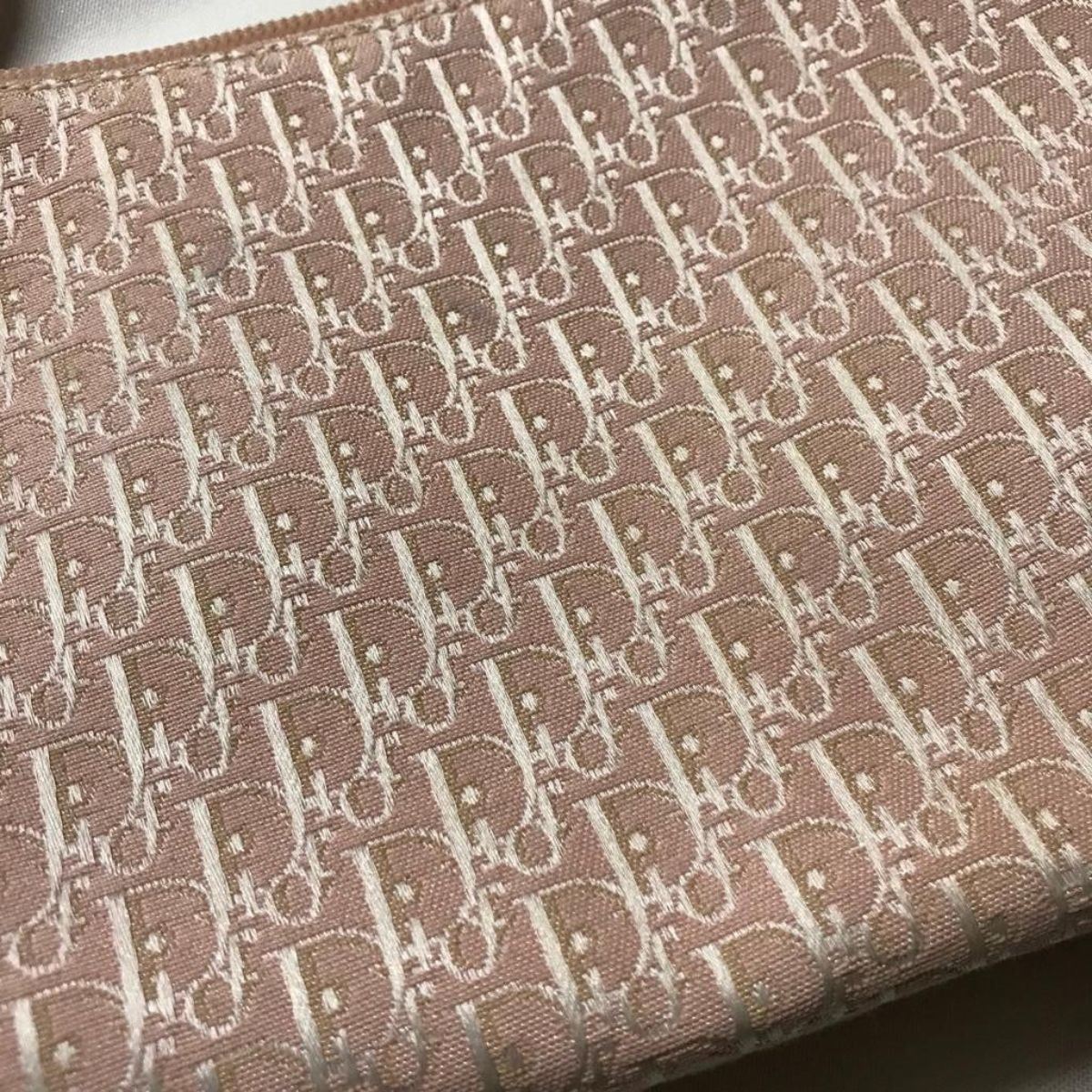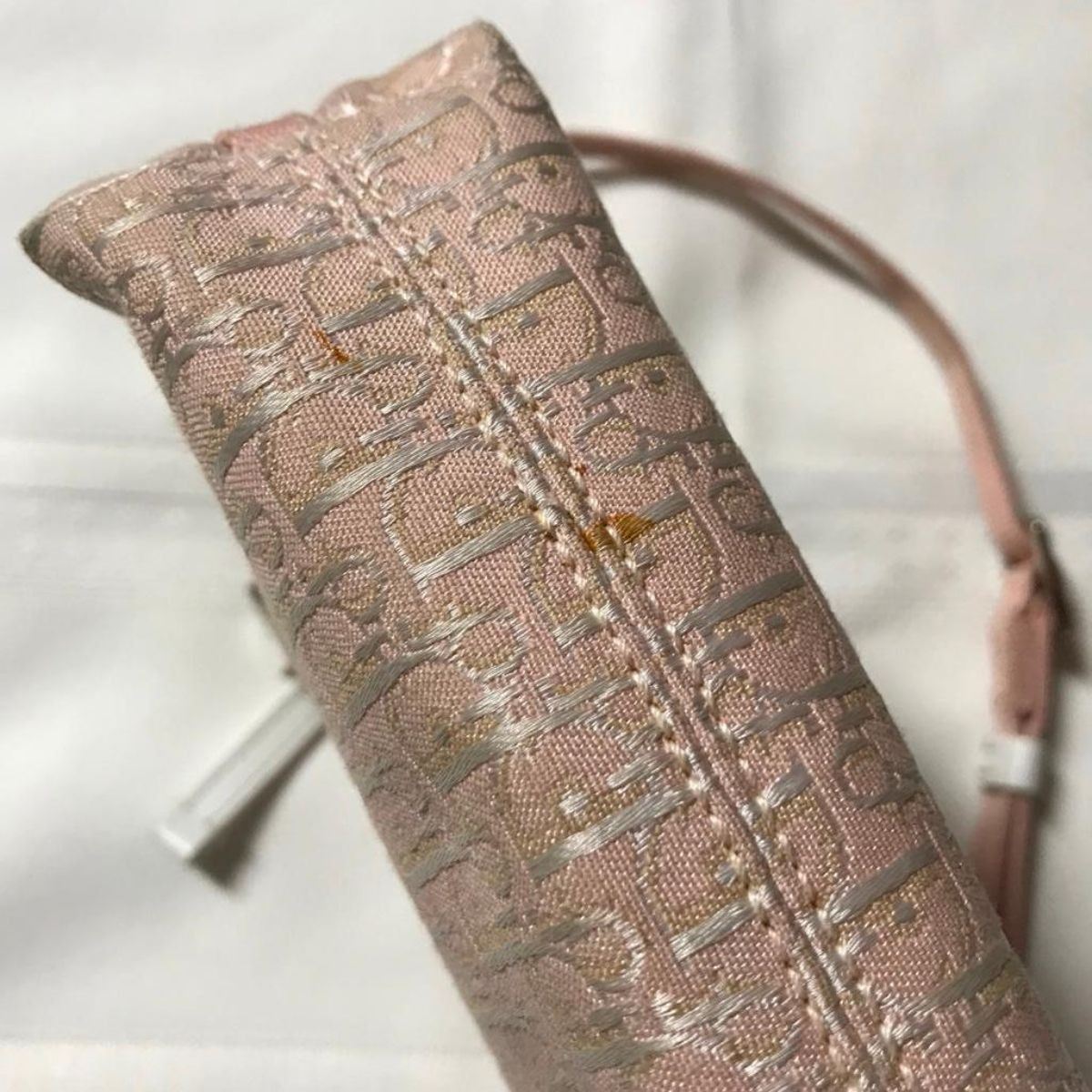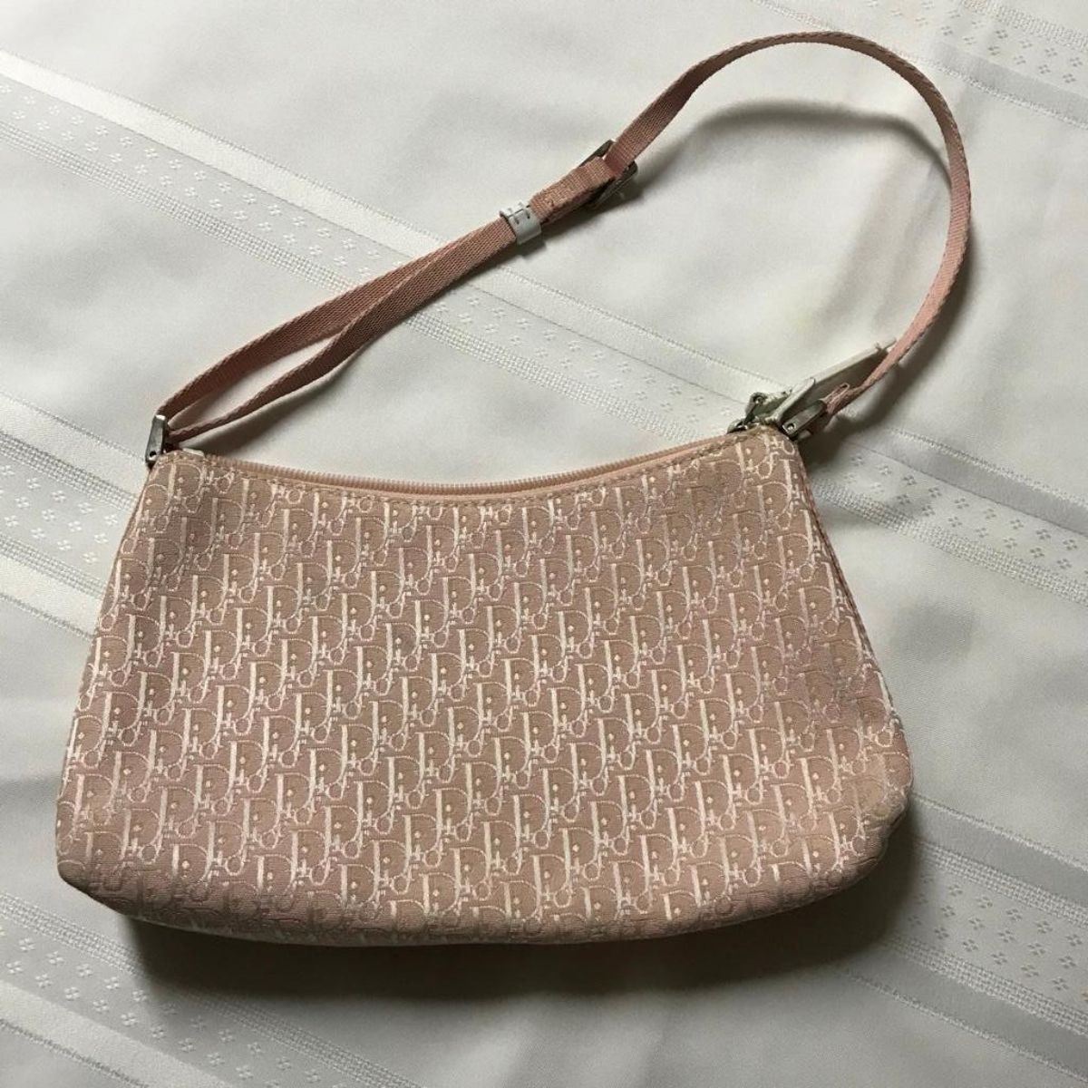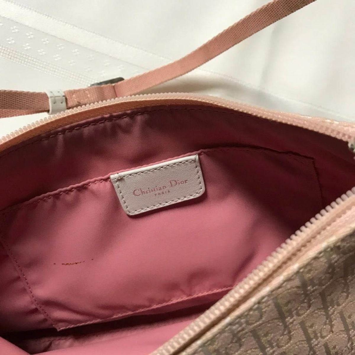Authentic Christian Dior pink/white mini logo handbag. Vintage from the early 2000's. Pink material lined inner compartment with white leather tag stamped Christian Dior Paris, & mini adjustable strap. Zipper with white leather pull. 10" W X 6" H. Sized for wallet, phone, keys, mini makeup, for  day or evening. * a few small stains to bottom, & one on interior pocket, as seen in photos. Â