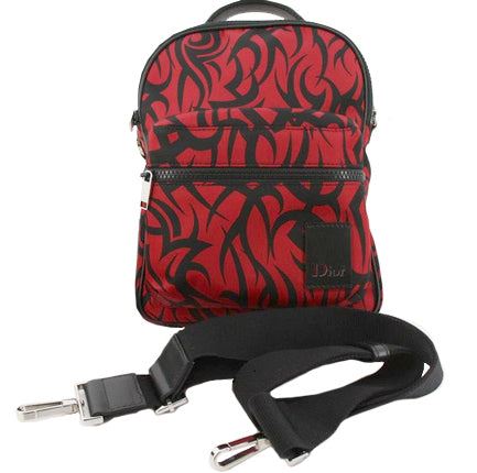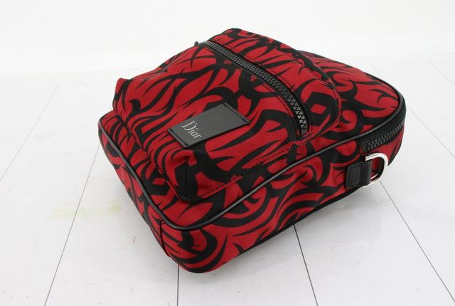 Christian Dior Red Black Nylon Tribal Rider Print Pattern Mini Shoulder Bag. All available information is listed in the description and shown in the photos. Christian Dior Mini shoulder bag features red and black nylon with Rider Tribal pattern print, silver-tone hardware, detachable black canvas shoulder strap, front pocket with zipper closure, top flat leather handle, zipper closure at top that will open to black canvas-lined interior with one slip pocket. Height 9", Width 7.5", Depth 2"