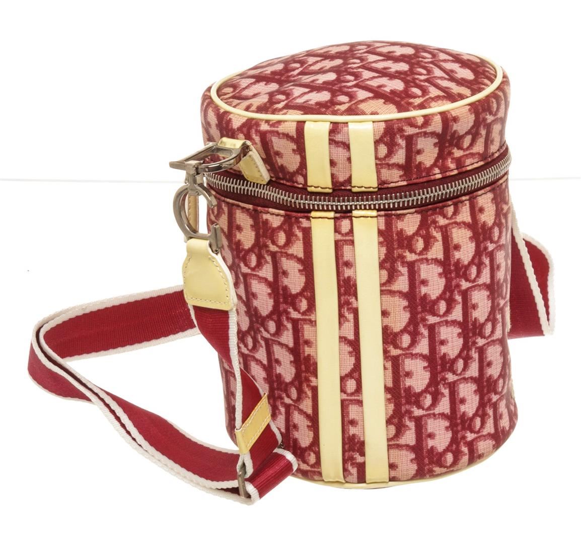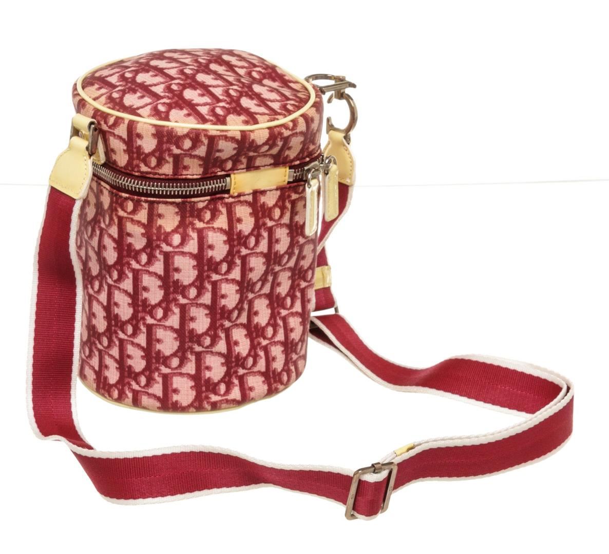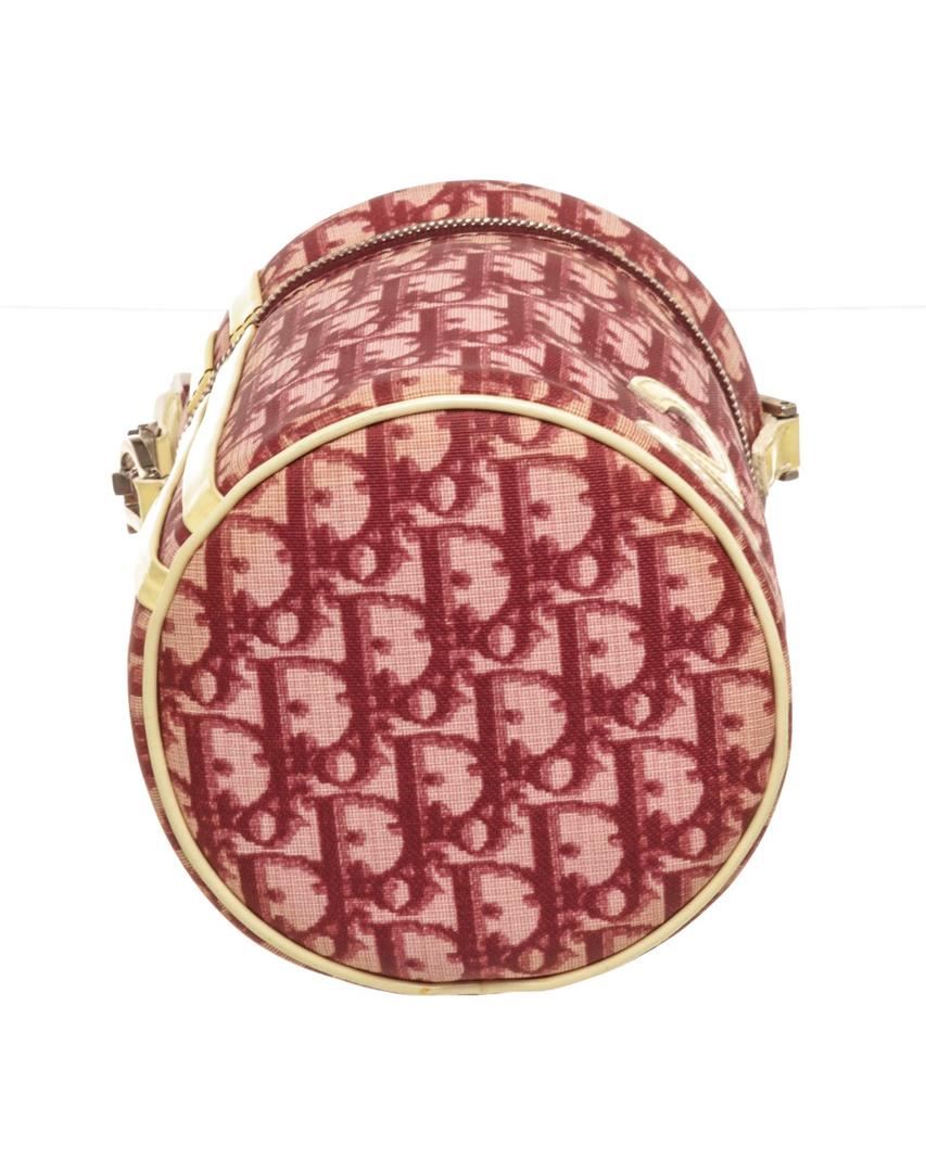 Christian Dior Pink Canvas Leather Trotteur Crossbody Bag with leather, gold-tone hardware, interior slip pocket, shoulder strap, and zipper closure.