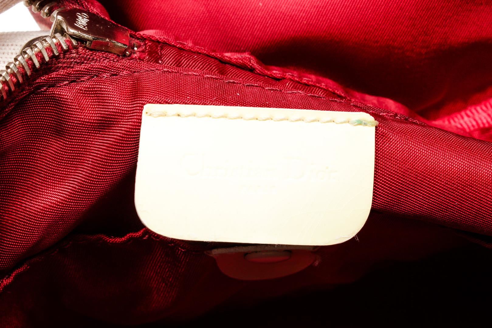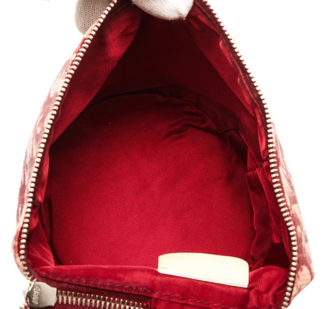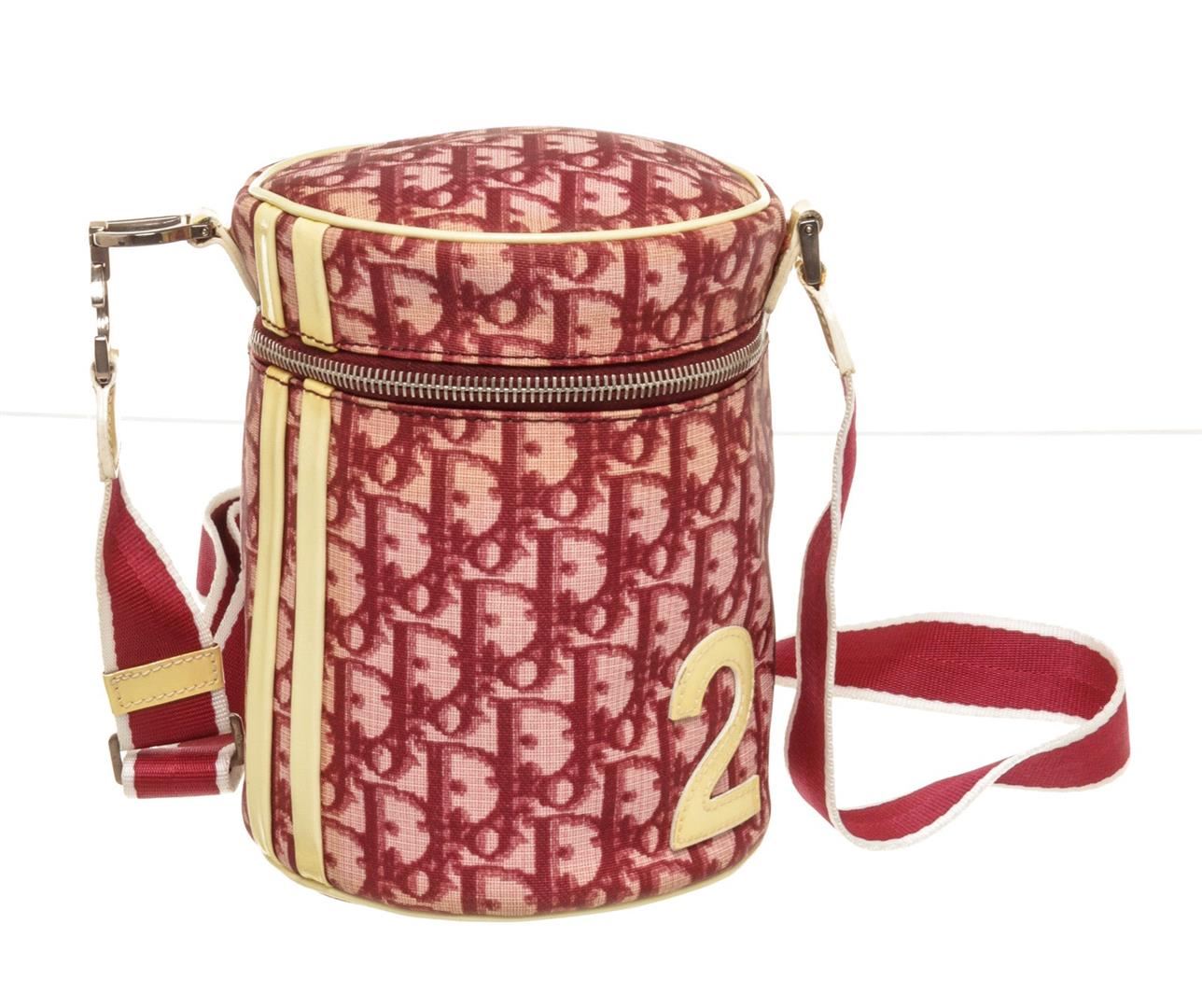Christian Dior Pink Canvas Leather Trotteur Crossbody Bag with leather, gold-tone hardware, interior slip pocket, shoulder strap, and zipper closure.