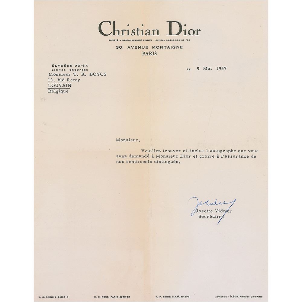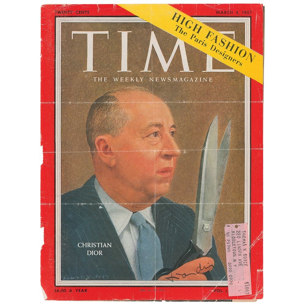 French designer (1905–1957) who earned a place as one of most influential figures in 20th century fashion. Cover for the March 4, 1957, issue of Time magazine, depicting Dior with a large pair of scissors in hand, 8.25 x 11, signed at the bottom in fountain pen. In very good condition, with several heavy intersecting folds, creases, and edge chips and tears. Accompanied by the original mailing envelope and transmittal letter from his office.