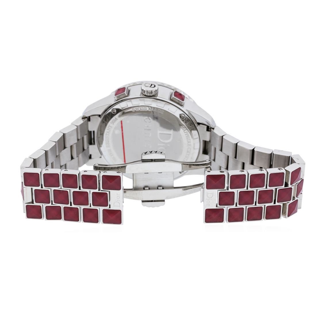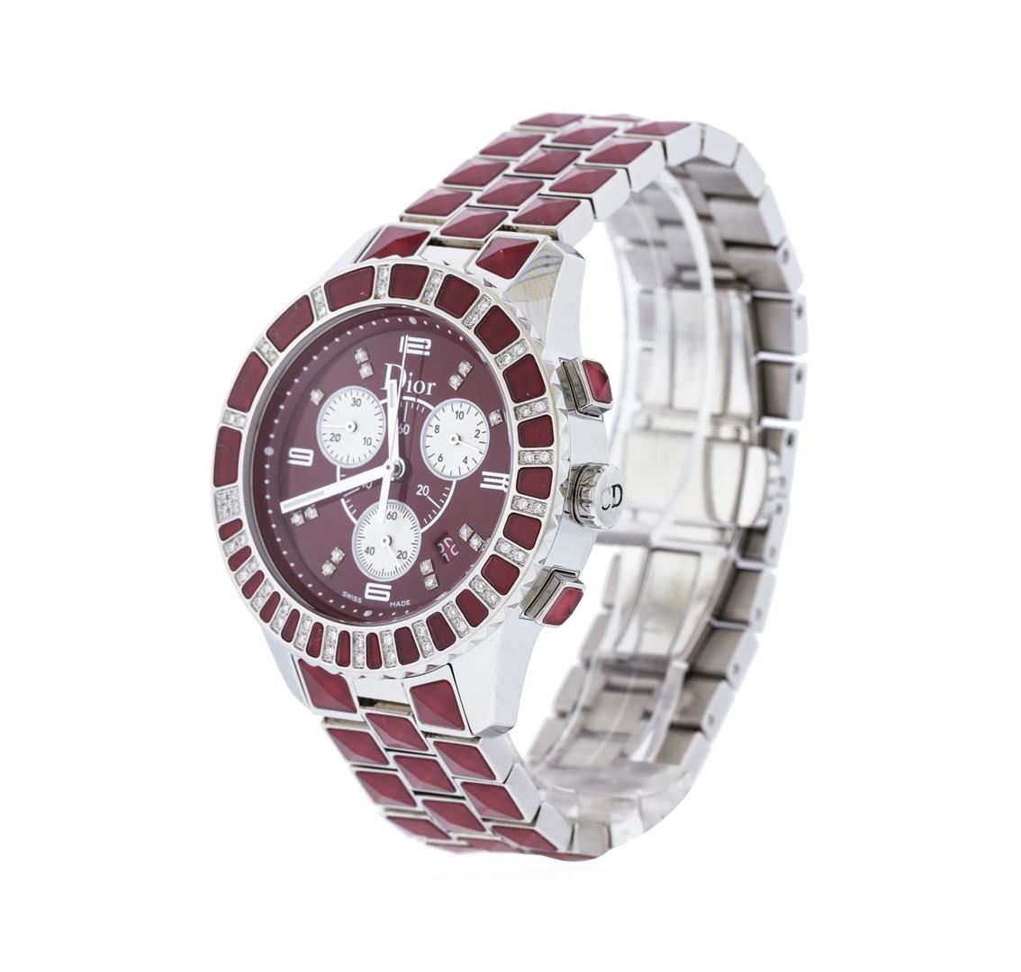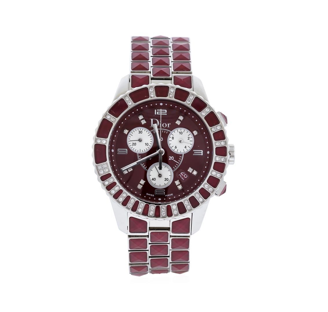 One Christian Dior burgundy ceramic men's watch featuring: Case: Stainless Steel, 39mm. Bezel: Stainless Steel, ceramic and diamonds. Crystal: Sapphire crystal. Dial: Red color; diamond set dial. Features: Date window located between the 4 and 5 o'clock positions. Bracelet: Stainless steel with burgundy ceramic, approximately seven and a quarter inches in length.