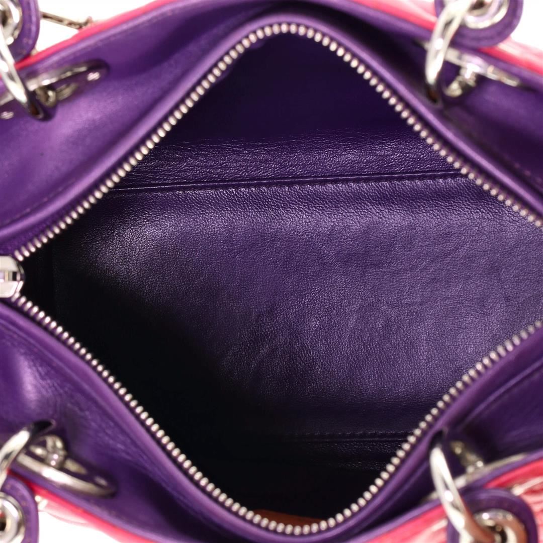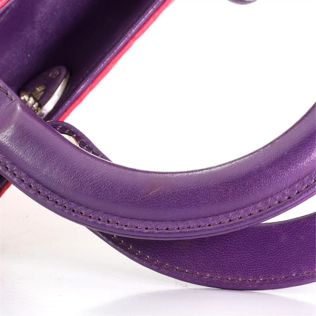 One Christian Dior Tricolor Lady Dior Bag Cannage Quilt Grained Lambskin Medium. Item is sold AS-IS. All available information is listed in the description and shown in the photo. Christian Dior Tricolor Lady Dior Bag Cannage Quilt Grained Lambskin Medium. Odor in interior. Creasing, wear and scuffs on exterior, strap and in interior, indentations on base, moderate wear on opening corners. Marks and indentations on handles, peeling on strap base edge, scratches and tarnish on hardware.
