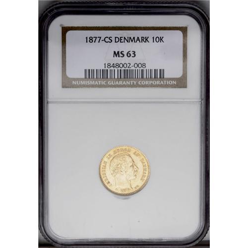 <B>Christian IX gold 10 Kroner 1877CS,</B></I> KM-790.1, MS63 NGC. The scarcest date of this type.