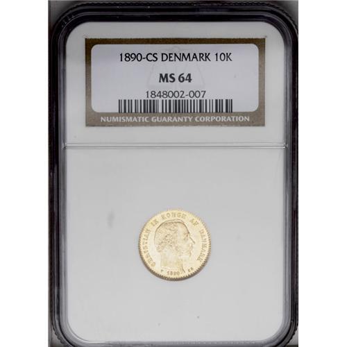Christian IX gold 10 Kroner 1890CS, KM-790.1, MS64 NGC. Christian IX gold 10 Kroner 1890CS,