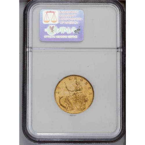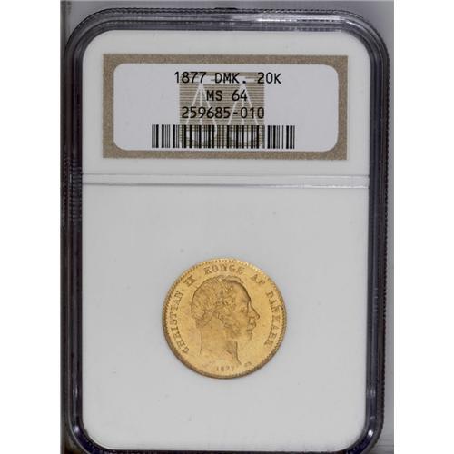 Christian IX gold 20 Kroner 1877, KM791.1, MS64 NGC, sc