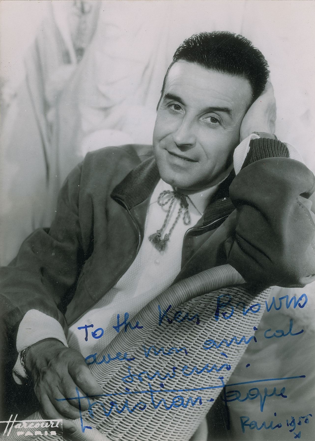 Scarce vintage glossy 5 x 7.25 photo of the award-winning director by Harcourt of Paris, signed and inscribed in blue fountain pen, "To the Ken Browns, avec mon amical souvenir, Christian-Jaque, Paris 1955 X.” In very good to fine condition, with scattered light creasing, and light surface impressions from typed notations on the back. The first signed photo of Christian-Jaque that we have offered.