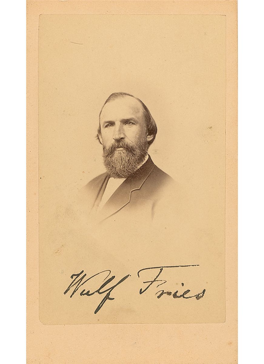 German-born American cellist. Original 2.5 x 4.25 carte-de-visite photo by A. Sonrel of Boston, signed at the bottom of the image in black ink, “Wulf Fries.” In fine condition, with just a bit of scattered light spotting to image, as well as some mild silvering.