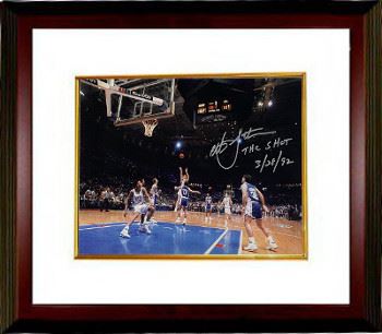 Christian Laettner played college basketball for the Duke University Blue Devils. He was the only college player selected for the 1992 United States men's Olympic team, nicknamed the "Dream Team". This famous shot highlighted his storied college career as a four year starter, four year Final Four participant, two time NCAA champion (91 & 92) and the 1992 AP Player of the Year. This shot was a buzzer beater in the regional final to defeat the Kentucky Wildcats 104-103 in what many consider the greatest game of all-time. Christian Laettner has hand signed this Duke Blue Devils Metallic 16X20 photo with The Shot 3/28/92 inscription. MAB Hologram and Certificate of Authenticity from Athlon Sports Collectibles. Custom White Mat and Premium Mahogany Color Framed as shown.