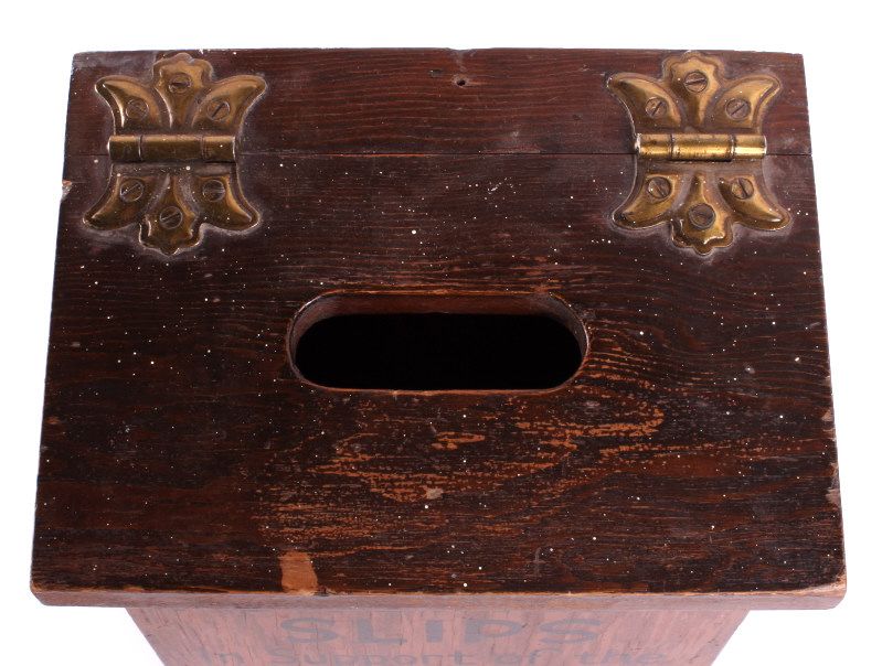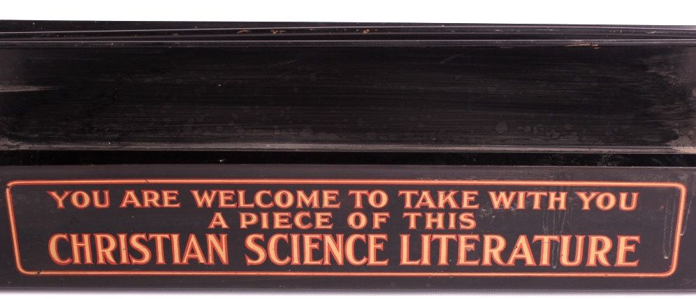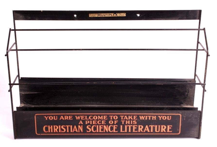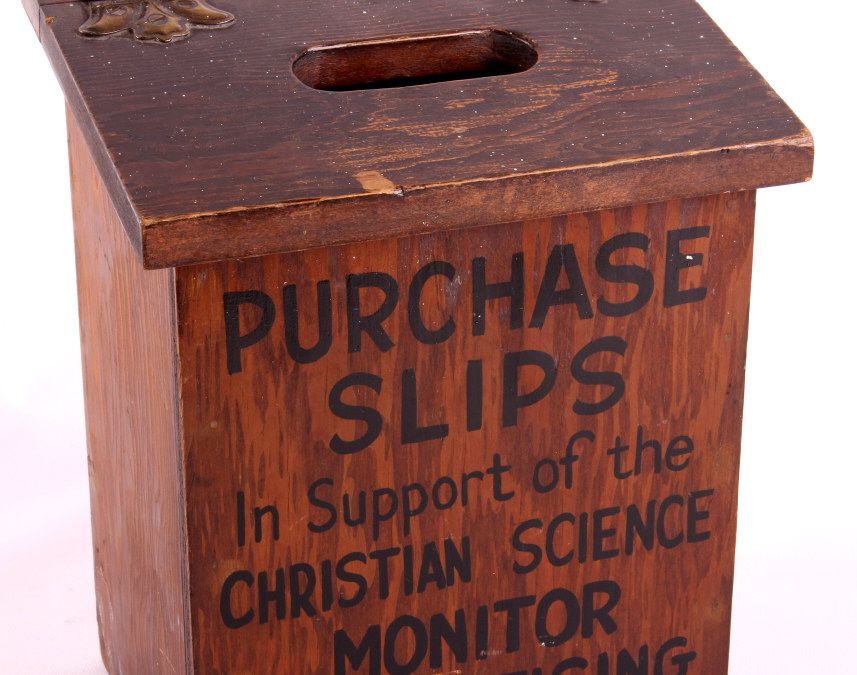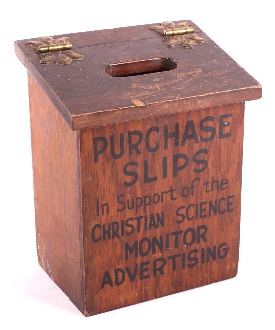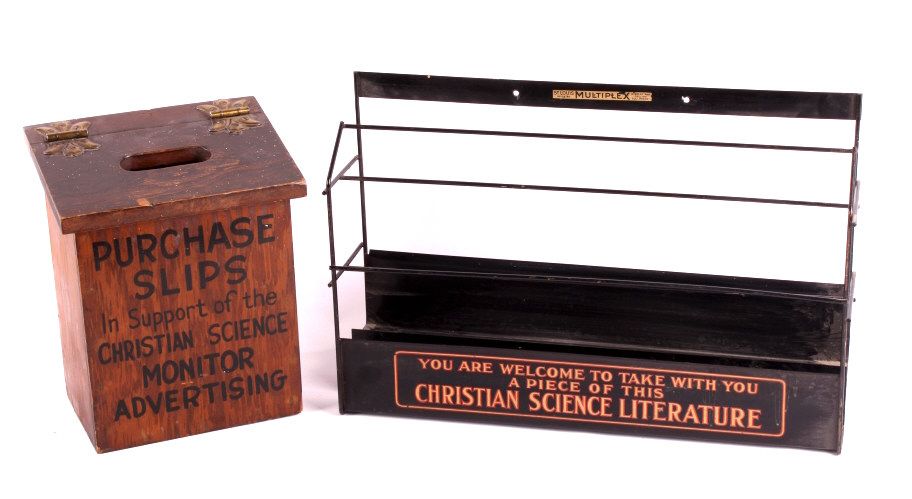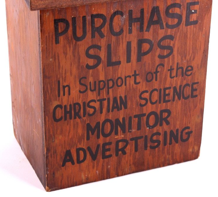 This is a Christian Science Monitor display rack and box. The rack was used to display and sell the Christian Science publications. Founded in 1908, the Christian Science Monitor is an international news organization still in operation today. The display rack and box are in good condition. The rack is 12" x 18" x 4.25". The box is 5.5" x 10.5" x 8.5".