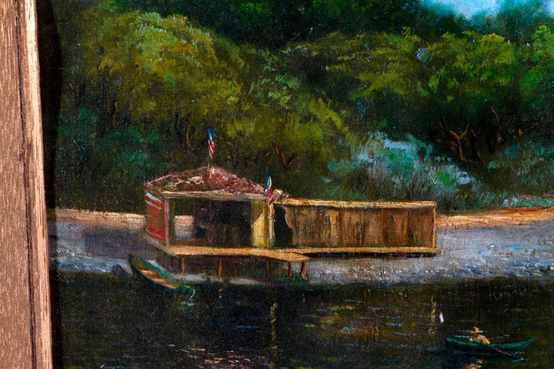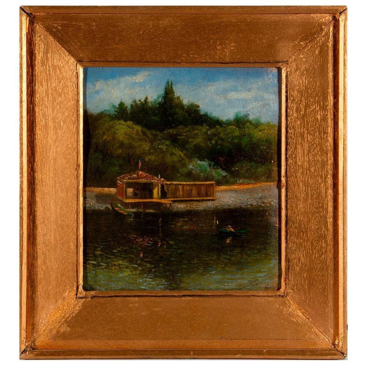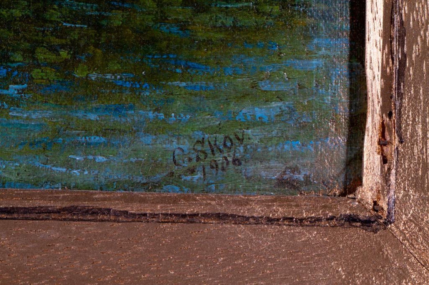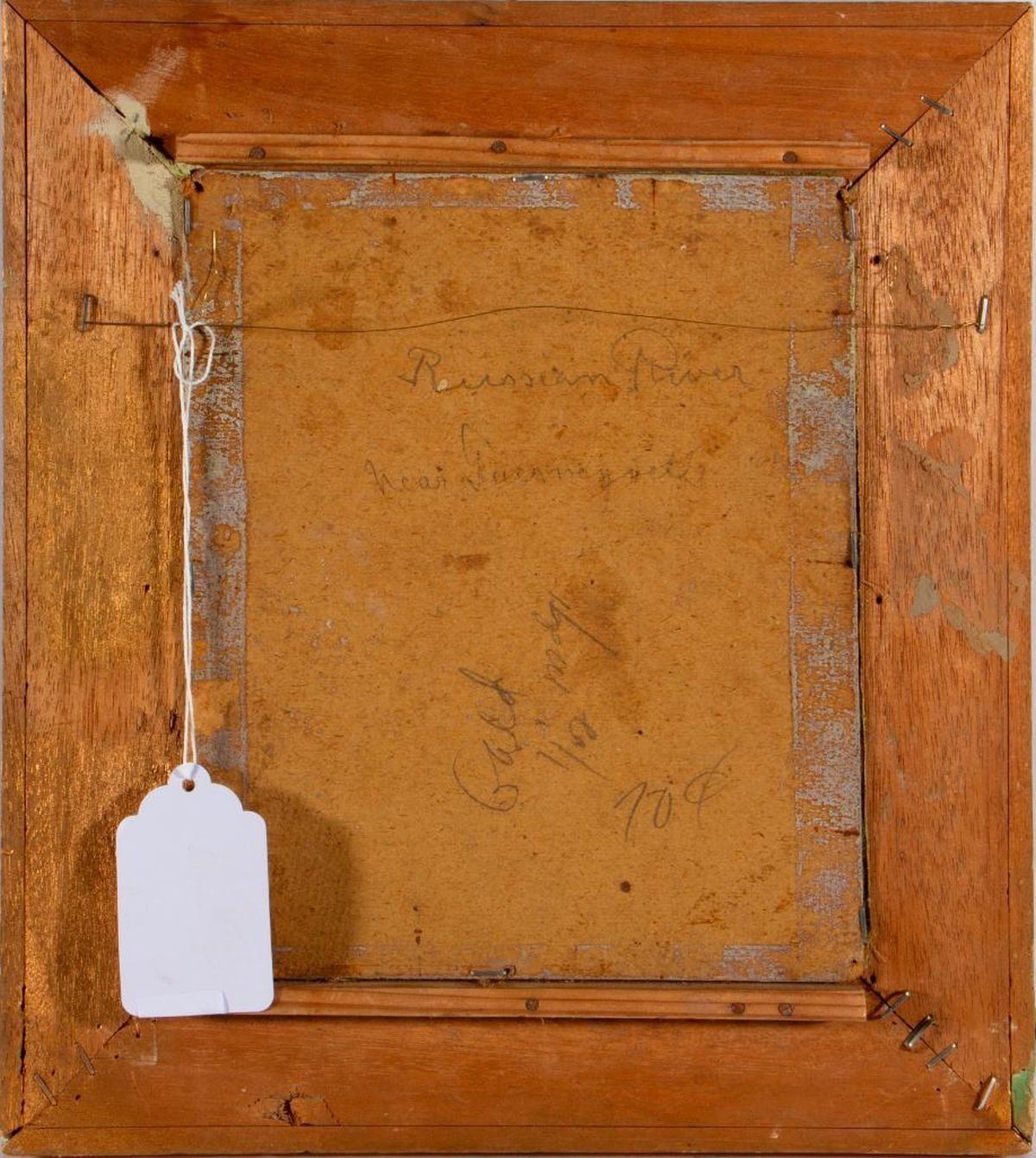 Artist: Christian Skov (1856 - 1942). Title/Subject: Russian River near Guerneville. Signature: Lower right. Medium: Oil on artist board. Size frame: 13 1/2" H x 12" W. Size image: 9 1/2" H x 8" W. Created: 1906. Condition: Good.