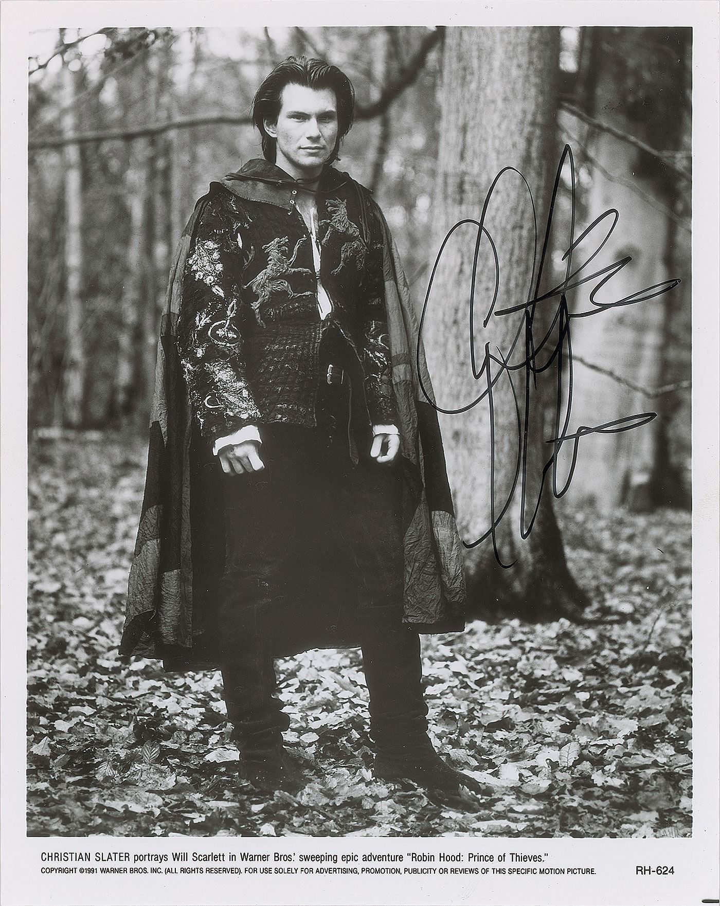 Glossy 8 x 10 Warner Brothers publicity photo of Slater as Will Scarlett from the 1991 film Robin Hood: Prince of Thieves, signed in black felt tip. In very fine condition. From the Harvey and Rhoda Kuflik Collection.