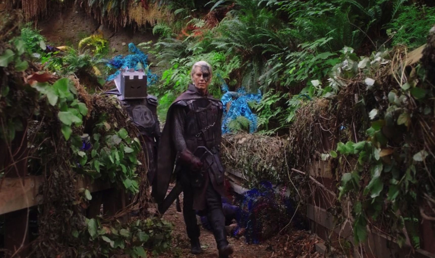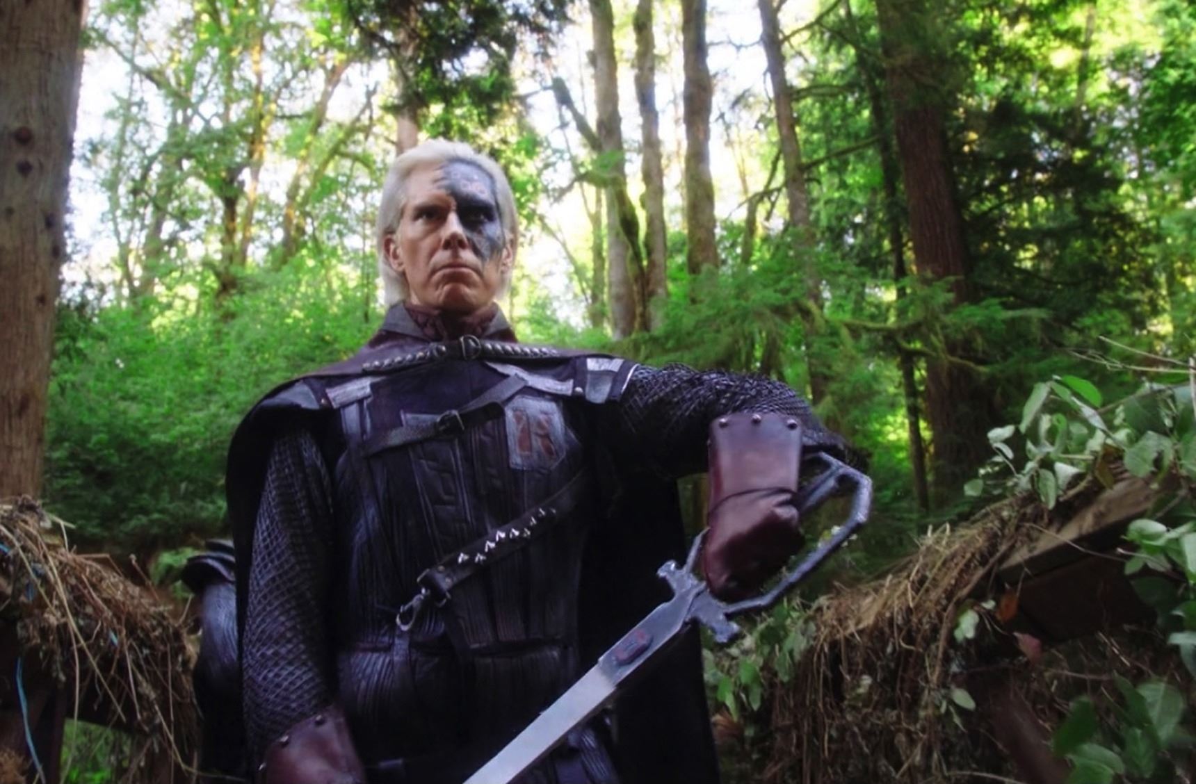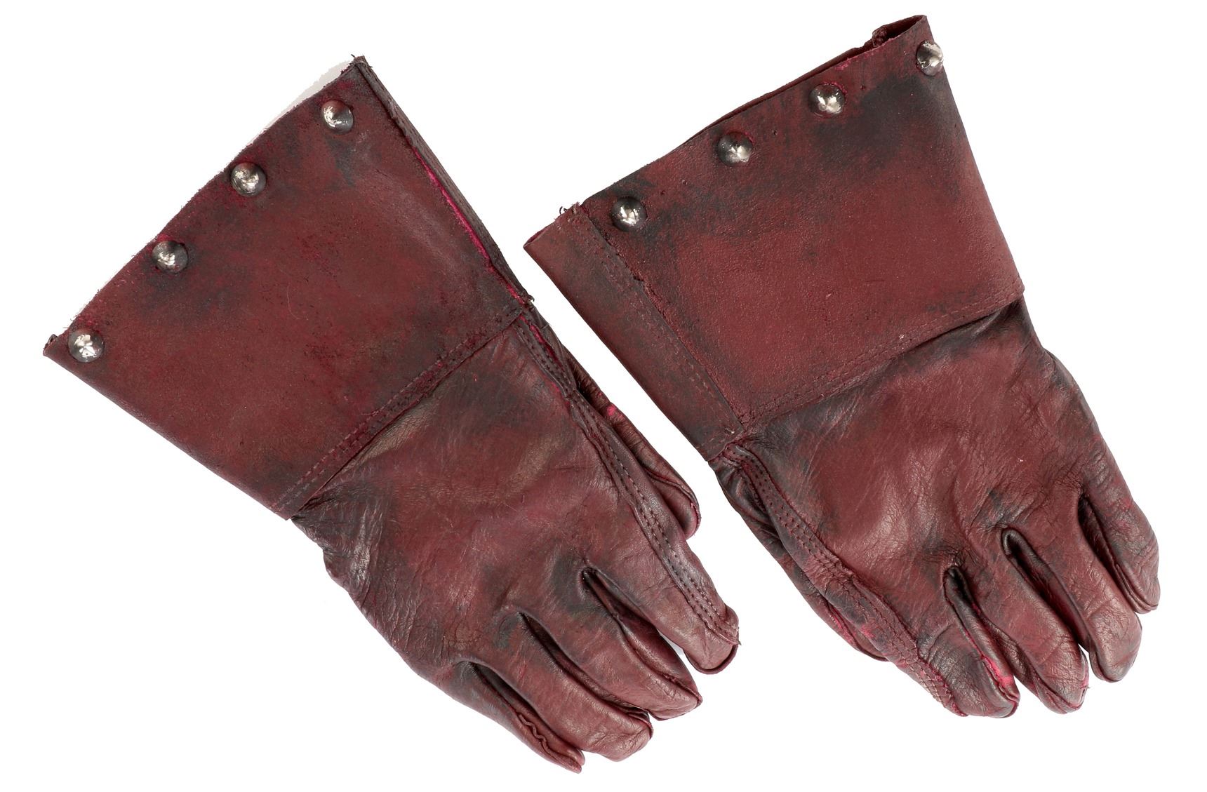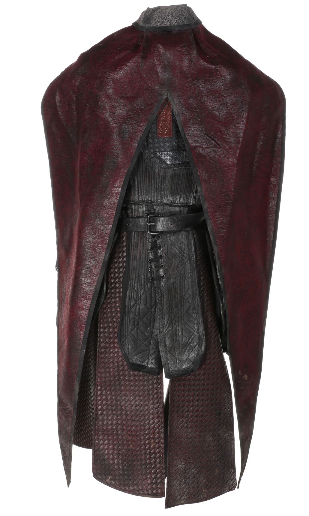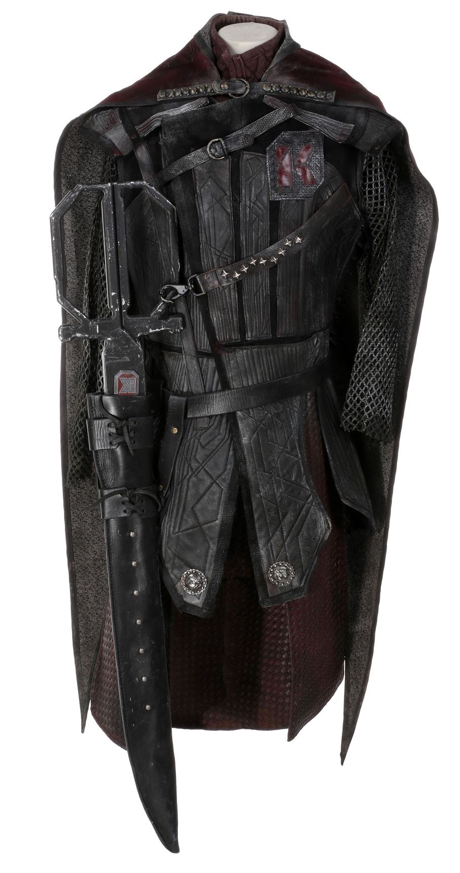 105. Christian Sloan "Lord Triangle Badevil" Kellum Knight ensemble with scissor sword and sheath from Dirk Gently's Holistic Detective Agency. (BBC America, 2016-2017) Fantasy costume designed by Deborah Gyug for Lord Badevil, leader of the Kellum Knights and the Mage's chief henchman. Consisting of a skirted tunic constructed of stamped faux leather, felt, and textured fabrics with ornamental belts, metal studs and molded horse head badges, stamped Kellum patches at chest and back, net sleeves painted silver to appear a chainmail, lace up sides and skirt panels, and concealed velcro front closure. Including textured fabric cape with studded leather strap and metal buckle neck closure, quilted fabric gorget with leather strap and metal buckle closure, and leather gauntlet gloves with studded wrists. All but gloves retaining internal costumer's label marked, "137. Badevil Stunt". Tunic with internal Deborah Gyug designer label. Together with a stunt Kellum Knight scissor sword constructed of wood with black painted handles, Kellum logo badges at pivot point, and a black leather studded sheath, black leather frog, and black leather and metal buckle belt. Sword in sheath measures 8.5 x 42 x 3.5 in. Some scuffing and chipping to sword and sheath. Light production wear to all. In very good condition. Starting Bid: $25