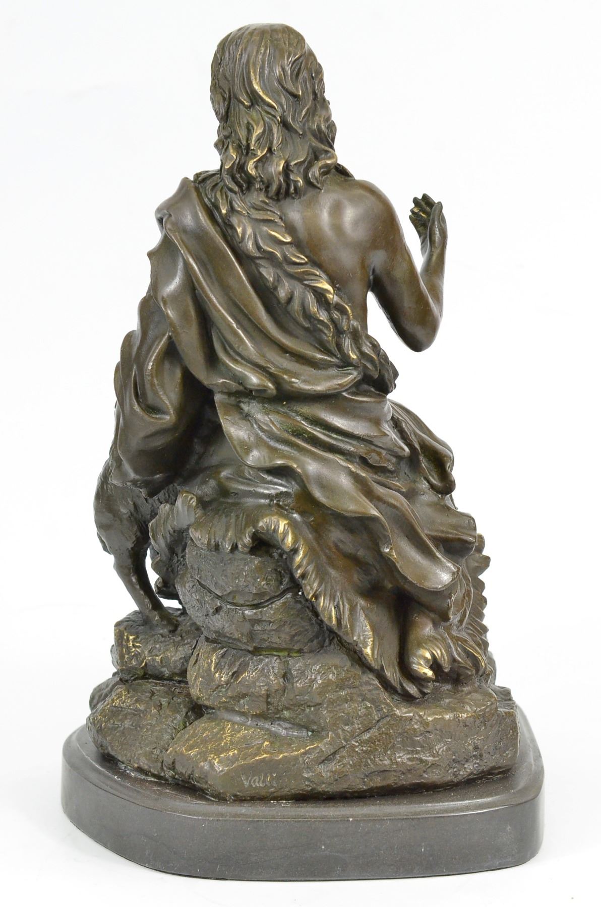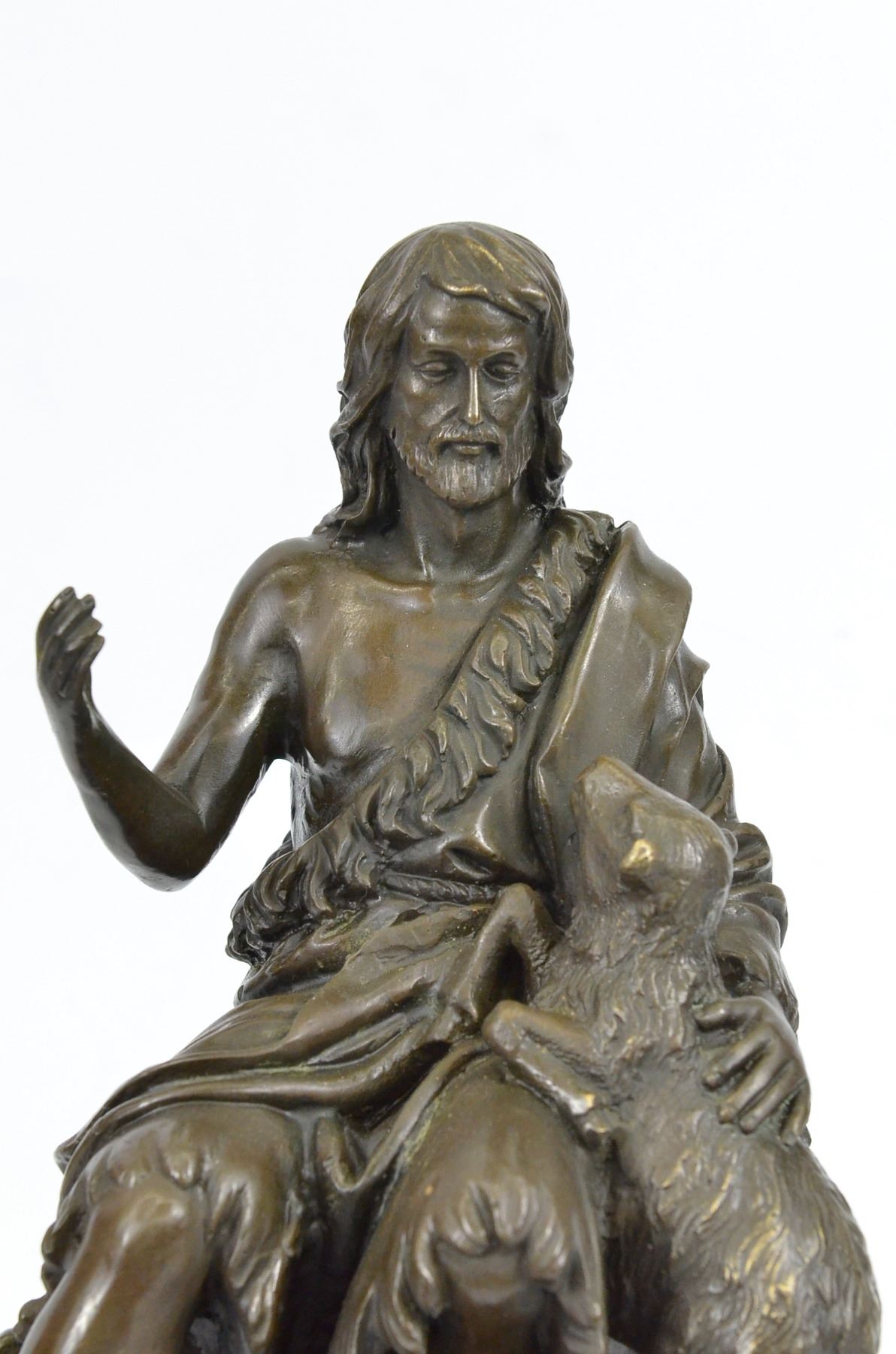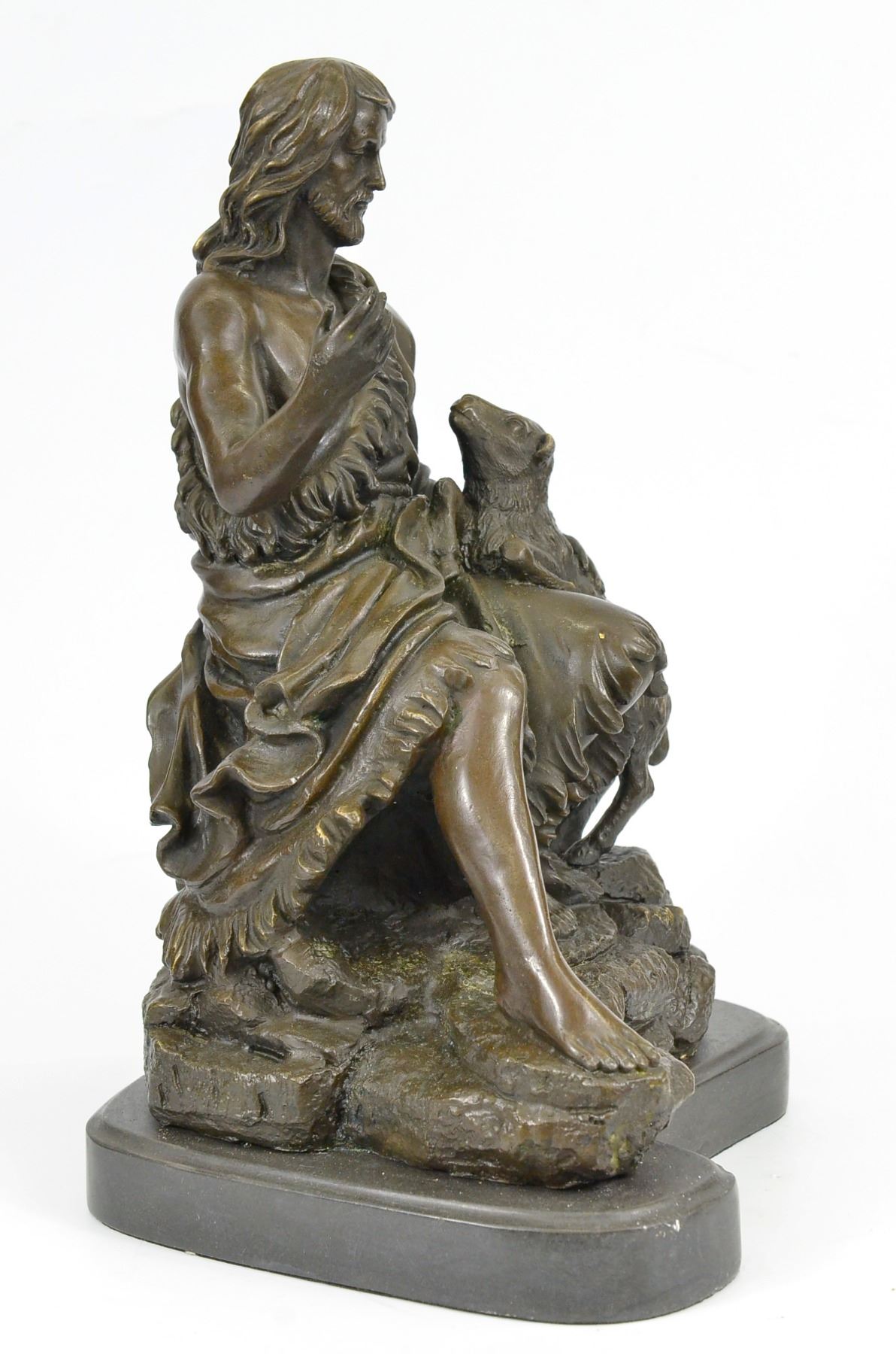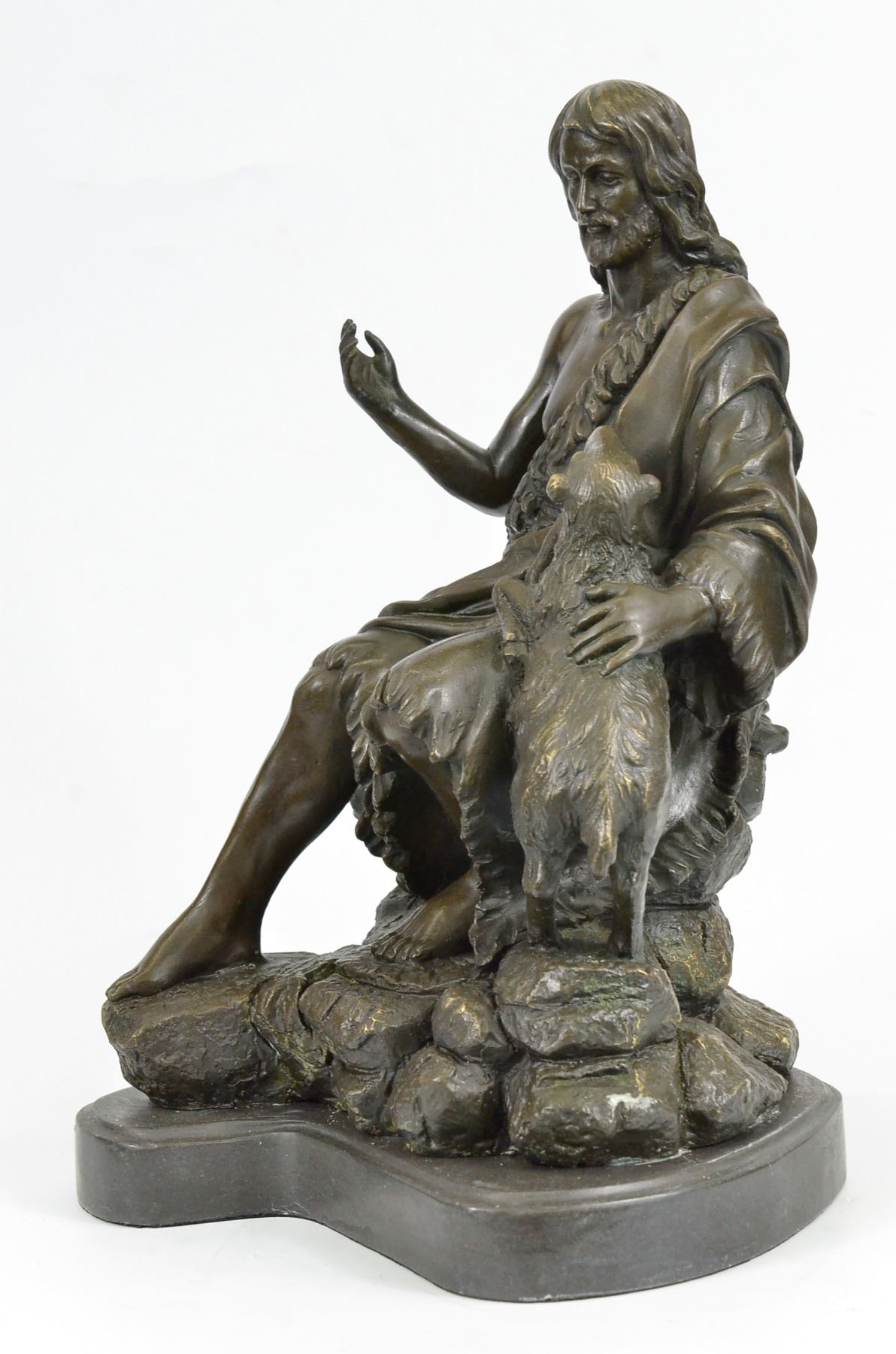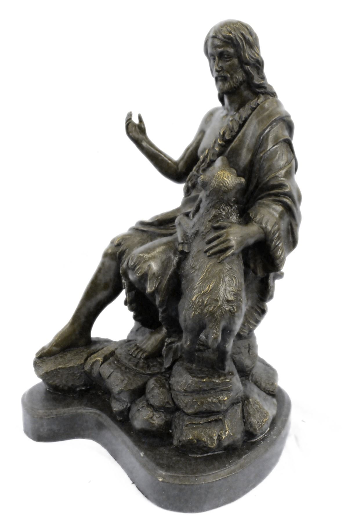 Jesus Christ Sits On A Rock Entwined By A Long Flowing Robe. He Raises His Hand Like An Antenna Gathering Everything In And Out Of His Divine Soul. With Eyes Slightly Closed, He Seems To Take A Deep Breath Inward, Gaining His Peace, That He Will Bestow To The World In Infinite Blessings. He Has This Sheep At His Side And He Is Trying To Climb On His Lap But Decided To Just Rest His Leg On His Thighs.The Bronze Handmade Sculpture Was Cast Using The Ancient Method Of Lost-Wax Casting And Stained With A Brown Patina Finish For Preservation and It Is Mounted Upon A Black Variegated Marble Base. Bronze dimensions with marble base: Height 14 X Width 8 inches. Weight: 18 lbs.Please Note: This is a reproduction bronze sculpture from the original molded and signed. This featured bronze sculpture is a recast after the original, and has been done recently. This 100% bronze sculpture is an abstract piece certain to be a conversation piece.Please Note: This is a reproduction bronze sculpture from the original molded and signed. This featured bronze sculpture is a recast after the original, and has been done recently. This 100% bronze sculpture is an abstract piece certain to be a conversation piece.
