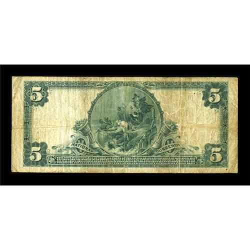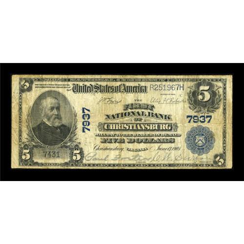 <B>Christiansburg, VA</B></I> - $5 1902 Plain Back Fr. 598 <B>The First NB</B></I> Ch. # 7937<BR> An extremely scarce bank in large size, with Track and Price showing just four such examples extant. This specimen is new to the census, and offered here to the collecting public for the first time. <B>Fine,</B></I> with clear signatures. <BR><BR><b>Shipping:</b> Coins & Currency (<a target="_blank" href="http://www.heritageauctions.com/common/shipping.php">view shipping information</a>)