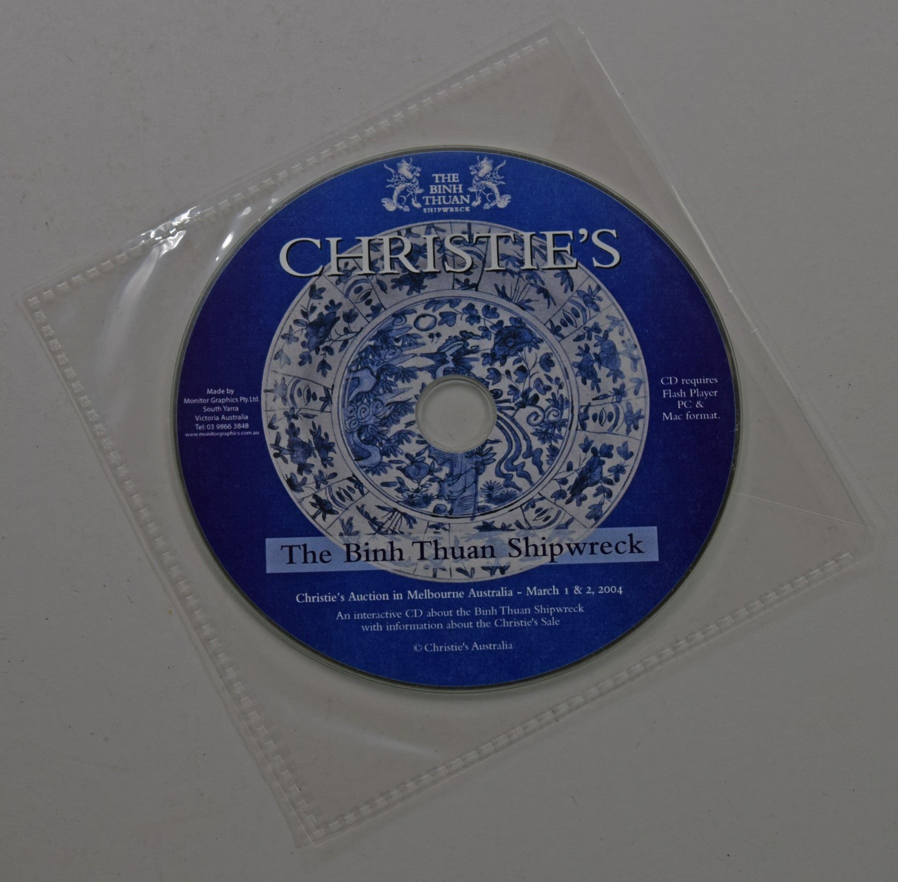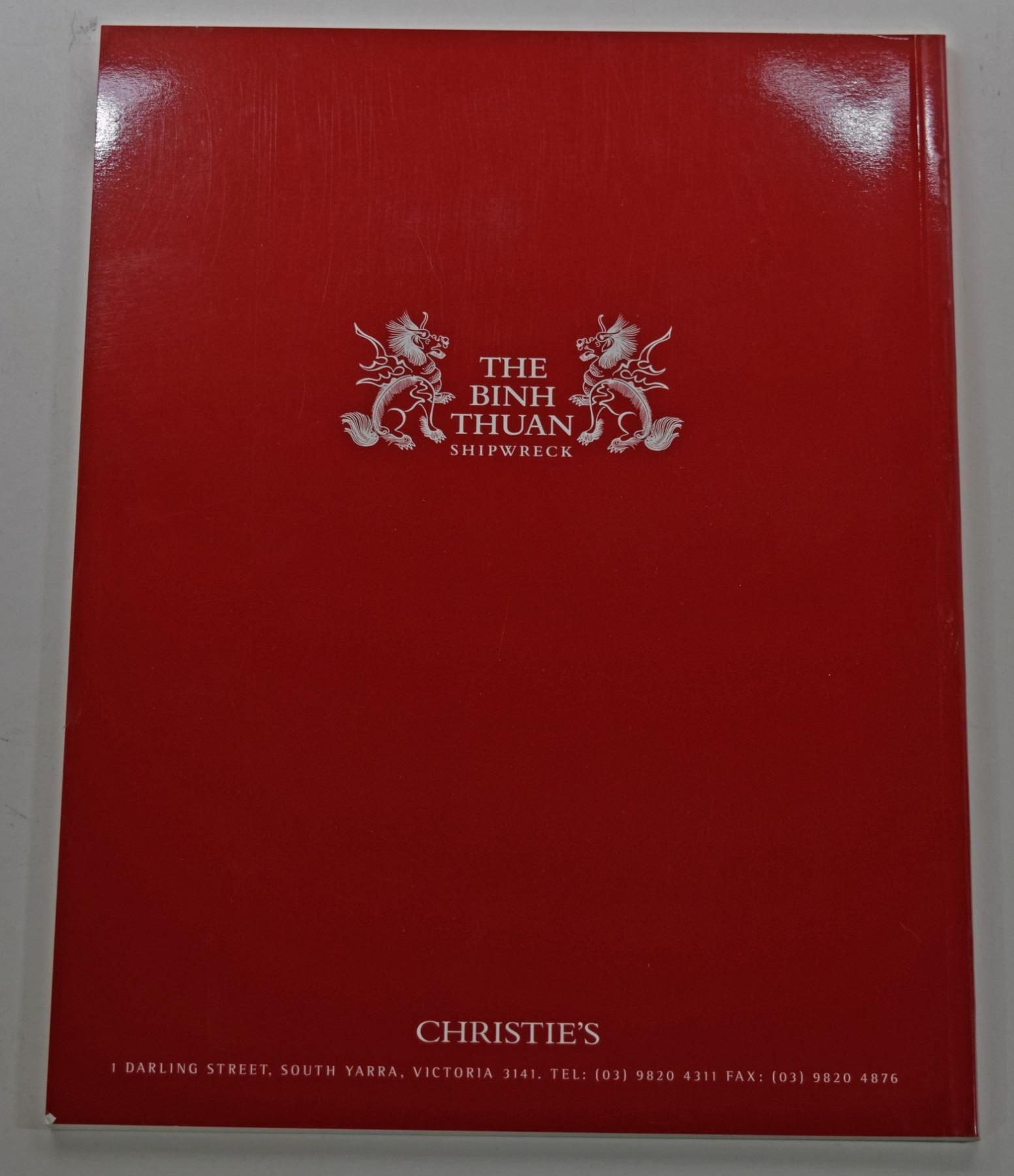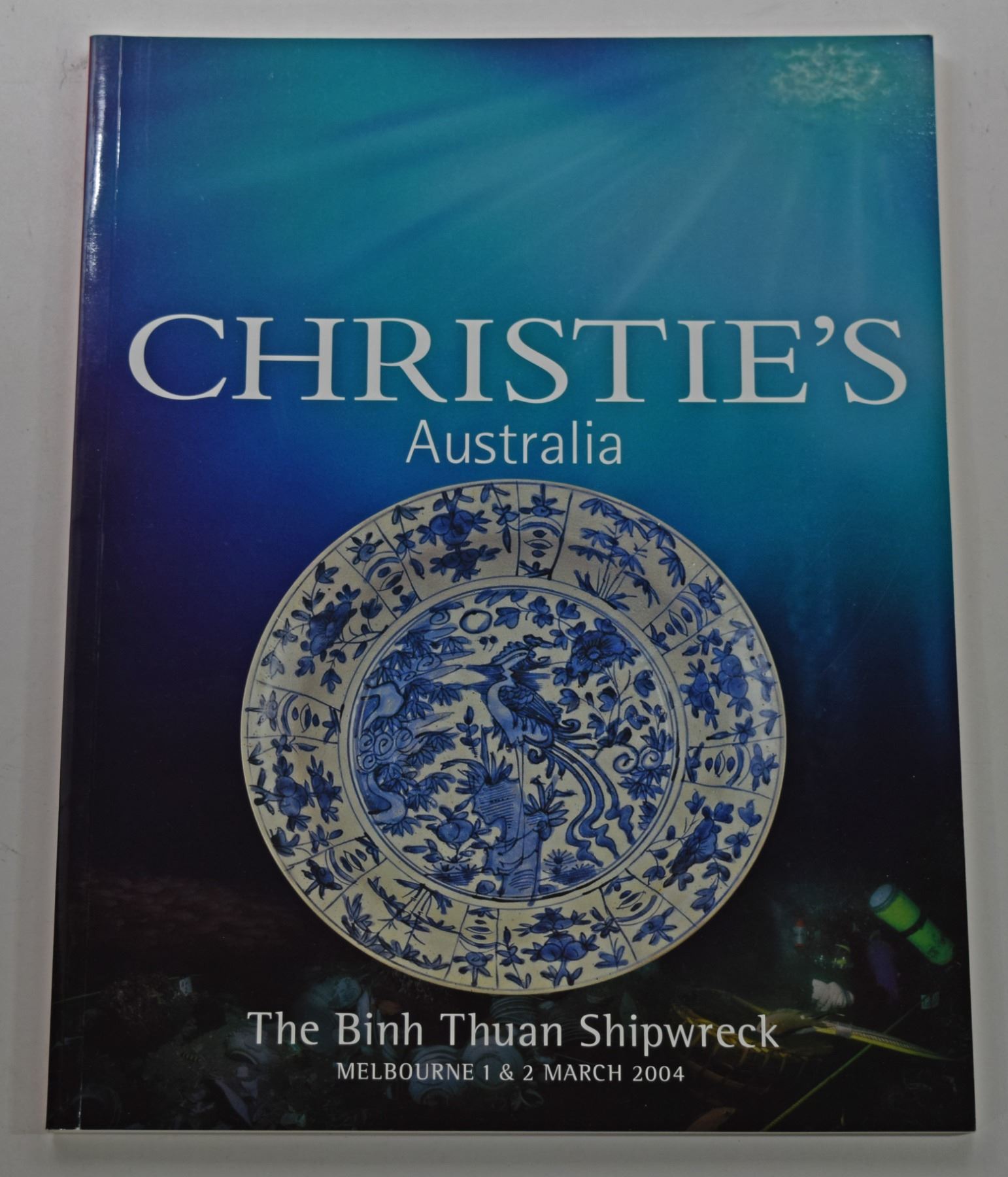 Christie's Australia. THE BINH THUAN SHIPWRECK. March 1-2, 2004. 4to, 92 pages; Softcover; Includes folder with DVD catalog; This auction catalog contains 760 lots of ceramics salvaged from an unknown shipwreck off the coast of Binh Thuan, Viet Nam. It is estimated that the ship sank between 1600 and 1610. The catalog includes a 13 page historical overview of the wreck and the salvage.