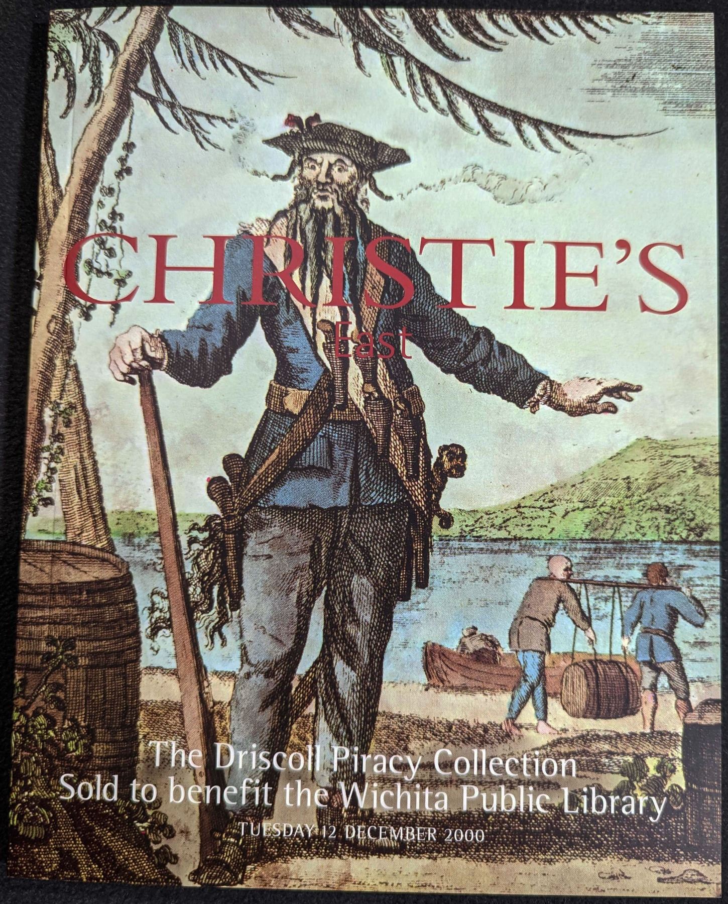 Christie's - East. THE DRISCOLL PIRACY COLLECTION SOLD TO BENEFIT THE WICHITA PUBLIC LIBRARY. December 12, 2000. 1-206 lots. 4to. This auction sale catalog includes pirate and treasure related literature, documents, broadsides, and maps that are from the collection of author Charles E. Driscoll. In 1951, a respectable newspaperman from Wichita passed away and sold his collection of books to the Wichita Public Library for the sum of $10,000. His name was Charles B. Driscoll, and he was a popular Midwestern columnist, who later corresponded from New York, in the expansively syndicated column 'New York By Day'. Driscoll's contribution to the library in Wichita was one of the more impressive libraries on the subject of pirates ever amassed. This sale includes 206 rare, printed books, manuscripts, prints and drawings from this collection, one of the largest ever put together. New York. original pictorial card covers. 74 pages. color illustrations. PRL. Fine. Lot weight: 0 lbs 11oz. Subject(s): Pirate, Treasure Literature.