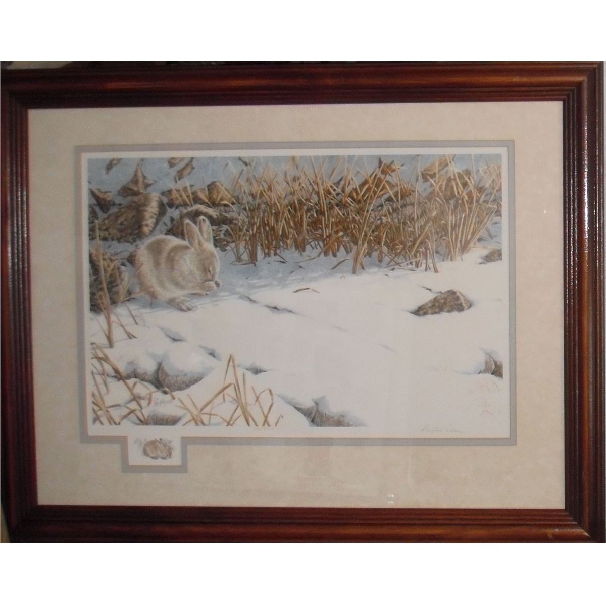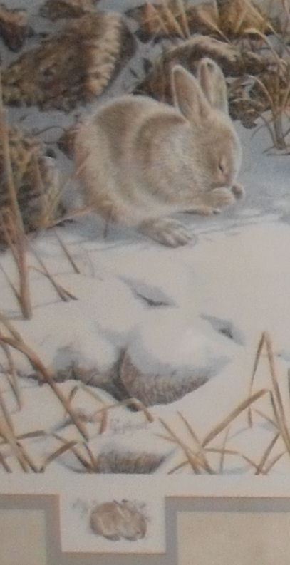 Likely 'Winter Hare' as wildlife, this limited edition lithographic signed and numbered print of only 2950 is this rabbit by Christine Wilson, image about 17 high x 22 with mat and frame 20 high x ap. 26 inches; collect this 1991 vintage edition with certificate and, signed also by Henry Lee as published by Conception Enterprises Inc., Ajax, Ontario, and printed in Canada !
