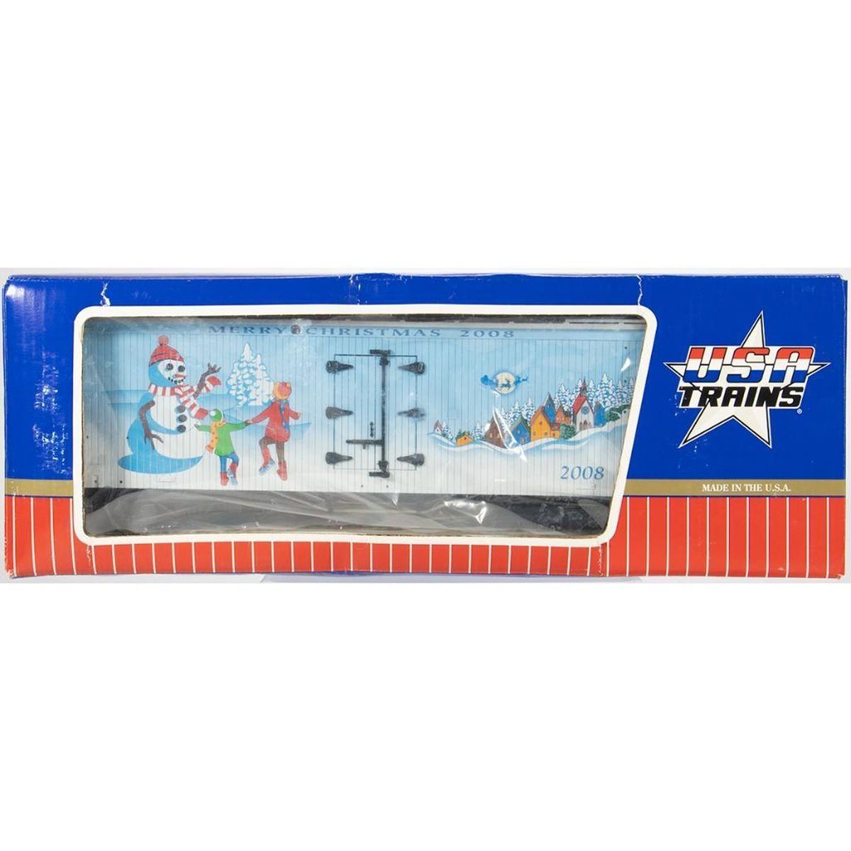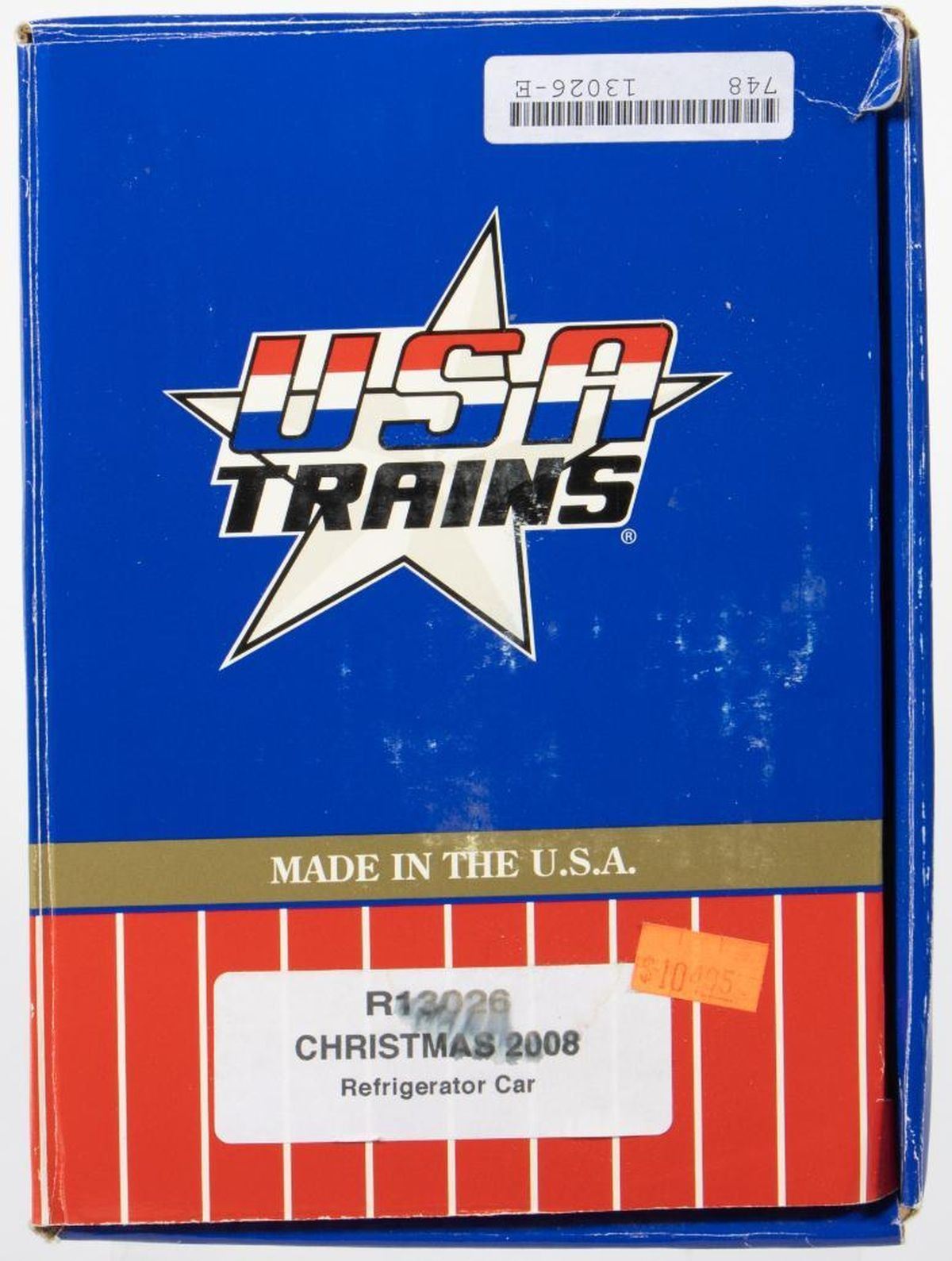 Christmas 2008 Reefer USA Trains R13026 Box with a lot of shelf wear and some bends around the window and label is smeared