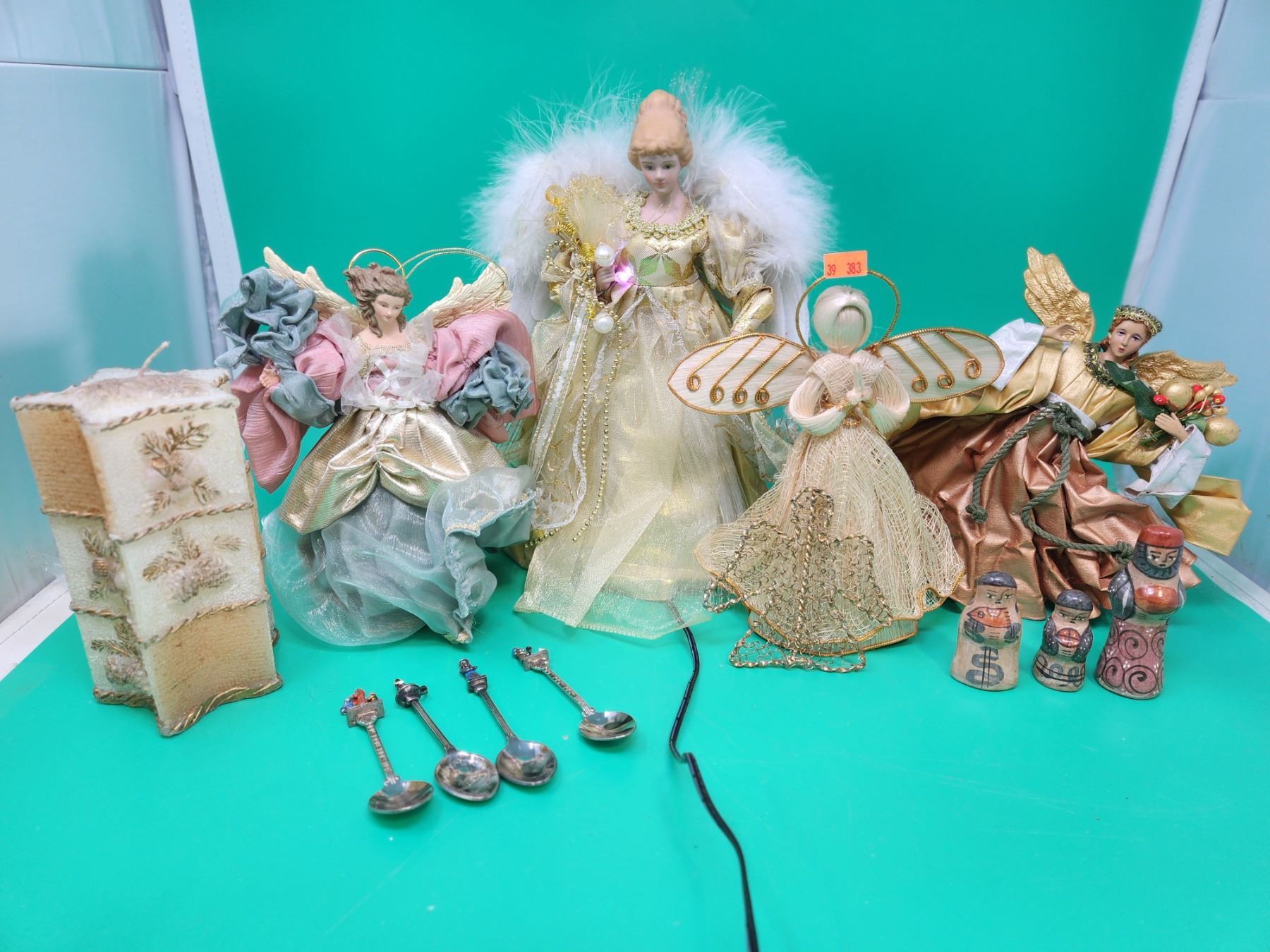 Christmas Decor Lot Lot w/ Mexican Pottery Nativity Figures, Angel Tree Toppers, & More